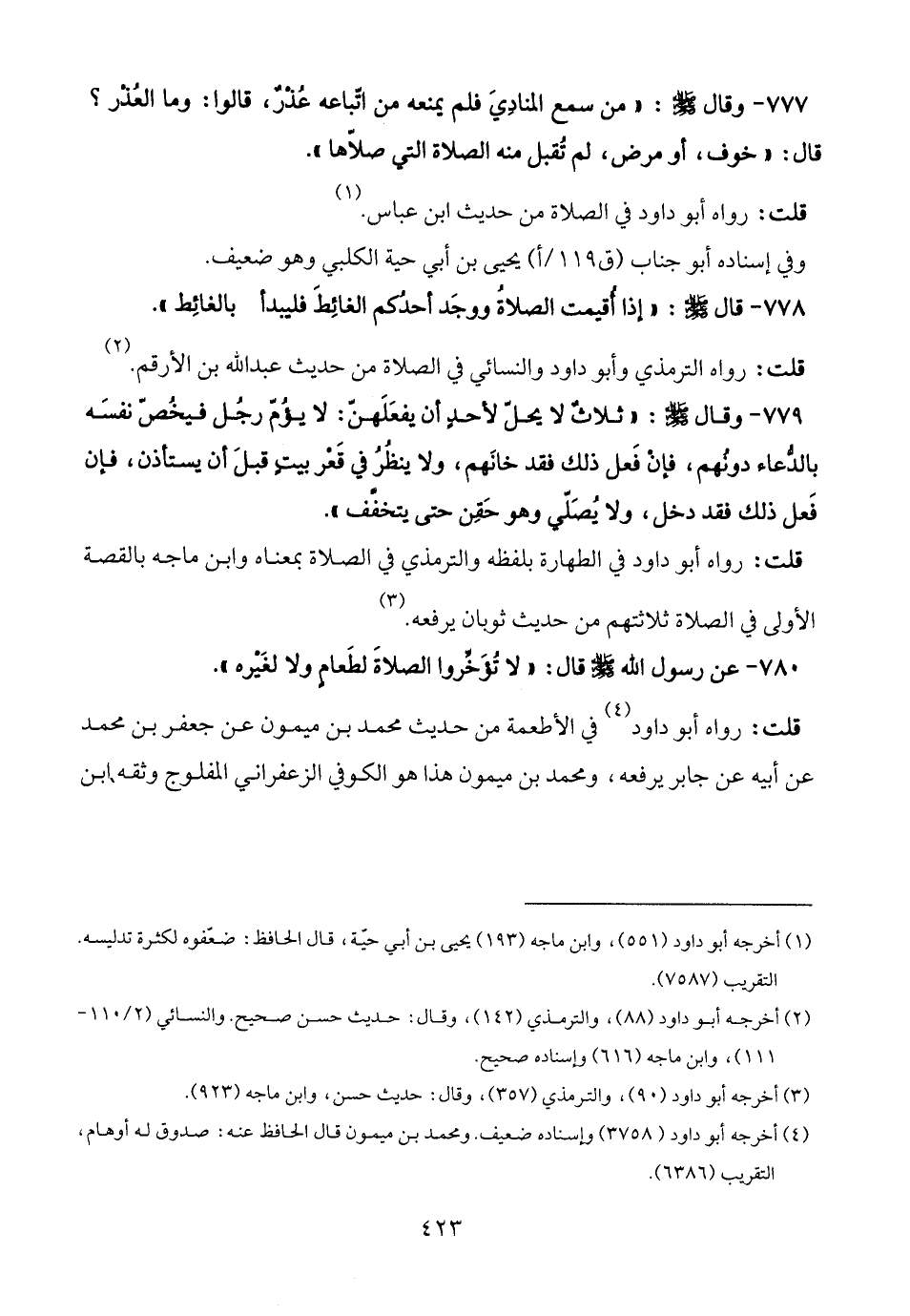 777 - وقال - صلى الله عليه وسلم -: "من سمع المنادِيَ فلم يمنعه من اتّباعه عُذْرٌ، قالوا: وما العُذر؟ قال: "خوف، أو مرض، لم تُقبل منه الصلاة التي صلّاها".