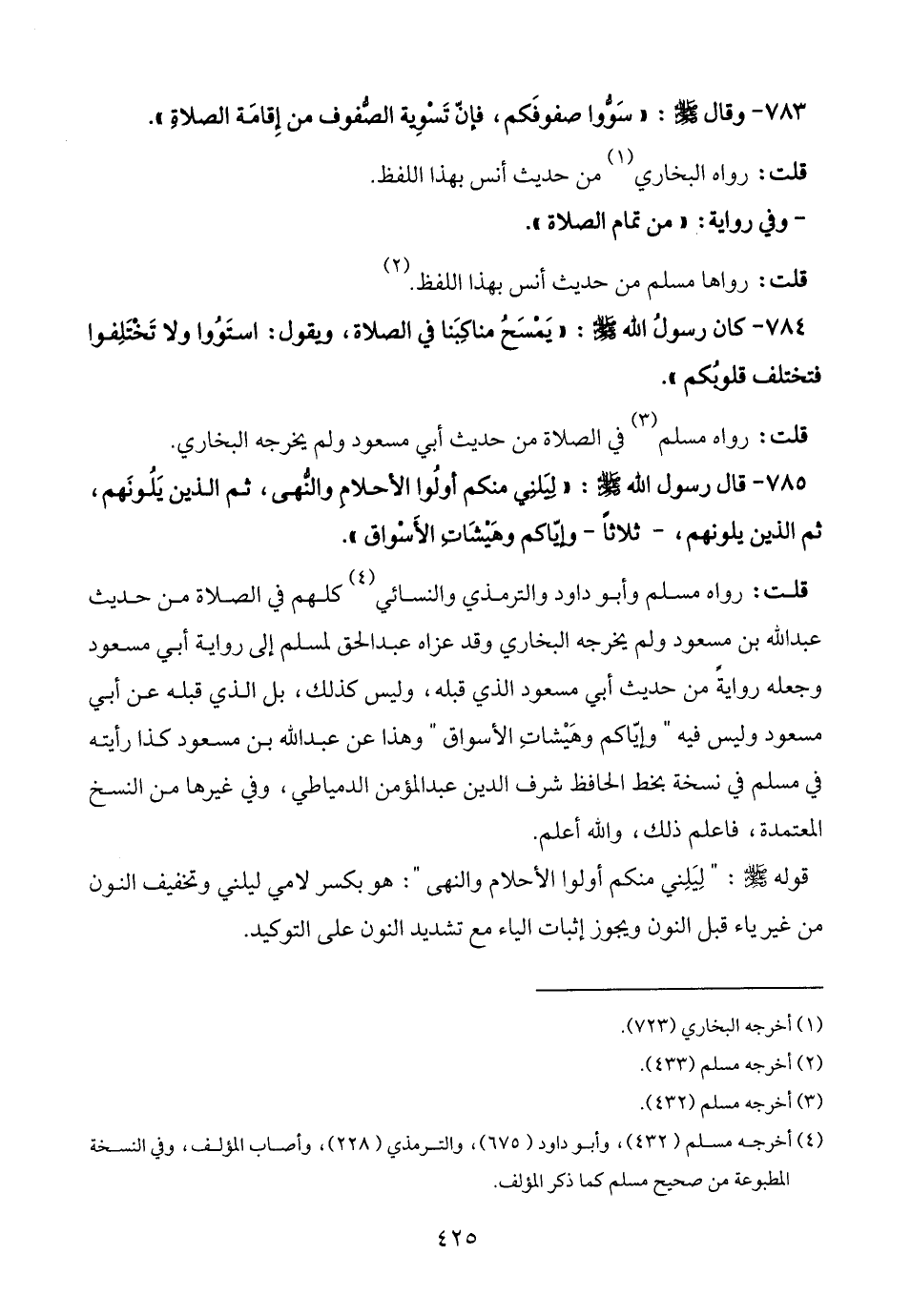 784 - كان رسولُ الله - صلى الله عليه وسلم -: "يمْسَحُ مناكِبَنا في الصلاة، ويقول: استَوُوا ولا تَخْتَلِفوا فتختلف قلوُبكم".