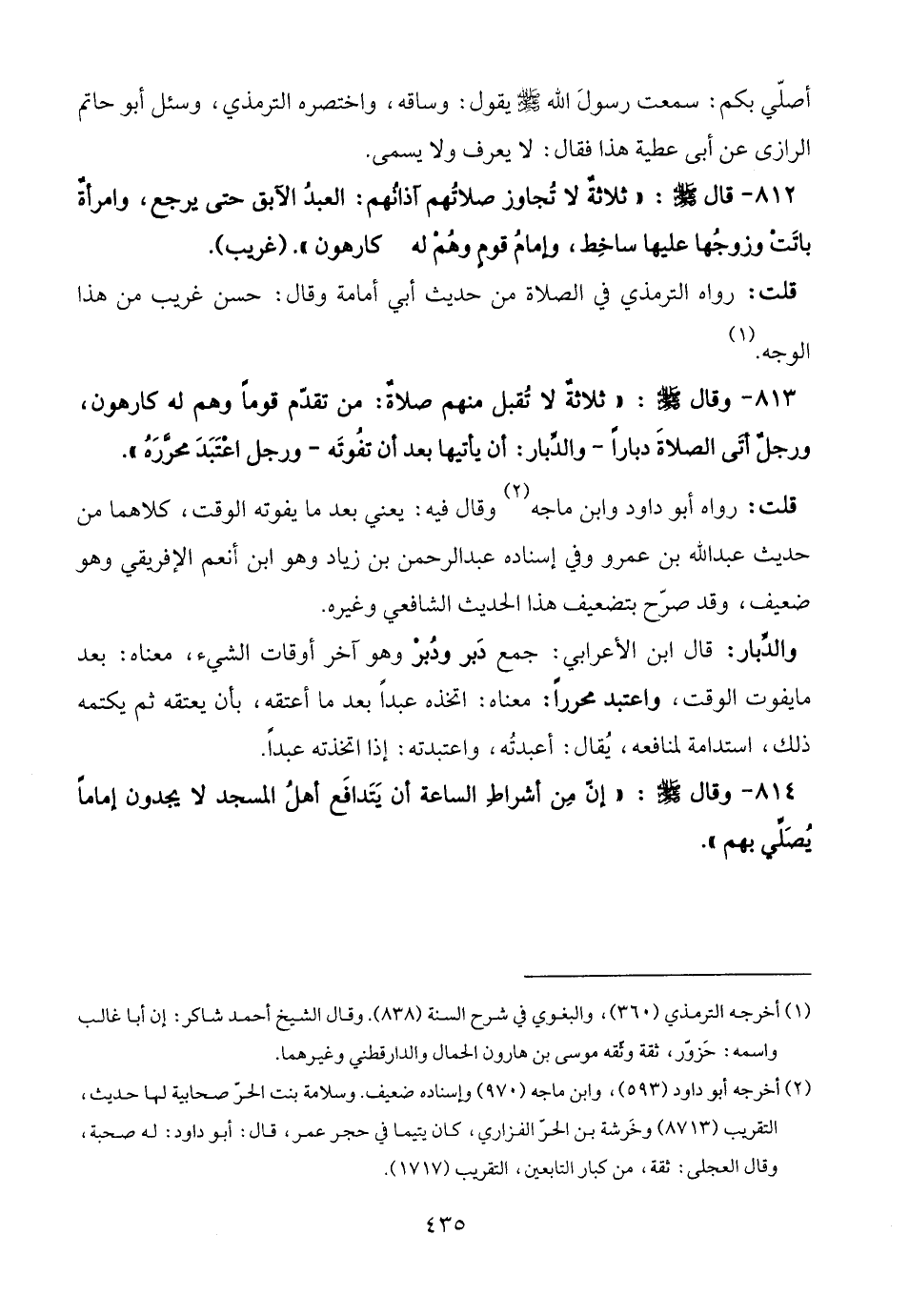 813 - وقال - صلى الله عليه وسلم -: "ثلاثةٌ لا تُقبل منهم صلاةٌ: من تقدّم قومًا وهم له كارهون، ورجلٌ أتَى الصلاةَ دبارًا -والدِّبار: أن يأتيها بعد أن تفُوتَه- ورجل اعْتَبَدَ محرَّرَهُ".