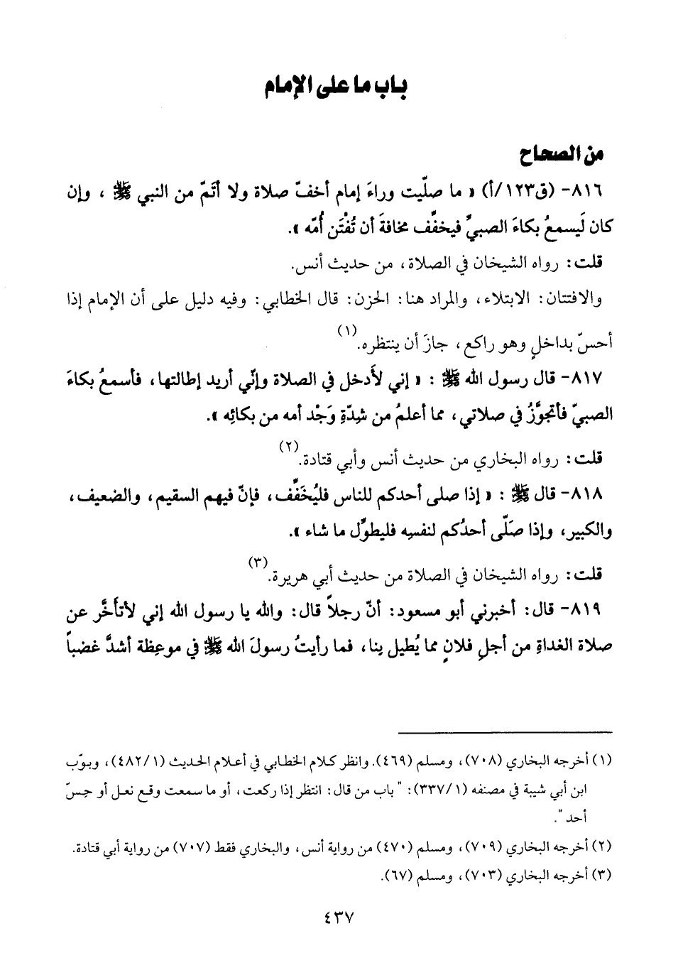 816 - " ما صلّيت وراءَ إمام أخفّ صلاة ولا أتمّ من النبي - صلى الله عليه وسلم -، وإن كان لَيسمعُ بكاءَ الصبيِّ فيخفِّف مخافةَ أن تُفتَن أُمّه".