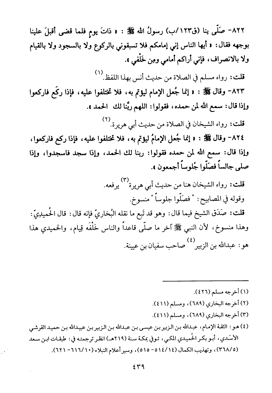 822 - صَلّى بنا رسولُ الله - صلى الله عليه وسلم -: "ذاتَ يومٍ فلما قضى أقبلَ علينا بوجهه فقال: "أيها الناس إني إمامكم فلا تسبقوني بالركوع ولا بالسجود ولا بالقيام ولا بالانصراف، فإني أراكم أمامي ومِن خَلْفي".