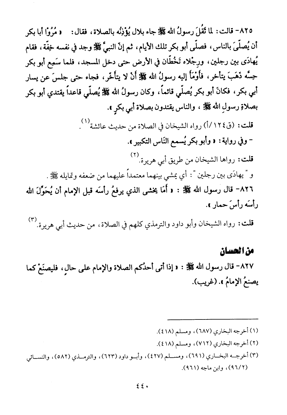 825 - قالت: لما ثَقُلَ رسولُ الله - صلى الله عليه وسلم - جاء بلال يُؤْذِنُه بالصلاة، فقال: "مُرُوا أبا بكر أن يُصلّيَ بالناس، فصلّى أبو بكر تلك الأيام، ثم إنّ النبيَّ - صلى الله عليه وسلم - وجد في نفسه خِفّة، فقام يُهادَى بين رجلين، ورِجْلاه تَخُطّان في الأرض حتى دخل المسجد، فلما سَمِع أبو بكر حِسَّه ذهَبَ يتأخر، فأوْمَأ إليه رسولُ الله - صلى الله عليه وسلم - أَنْ لا يتأَخّر، فجاء حتى جلسَ عن يسار أبي بكر، فكانَ أبو بكر يُصلّي قائمًا، وكان رسولُ الله - صلى الله عليه وسلم - يُصلّي قاعدًا يقتدي أبو بكر بصلاةِ رسولِ الله - صلى الله عليه وسلم -، والناس يقتدون بصلاة أبي بكر".