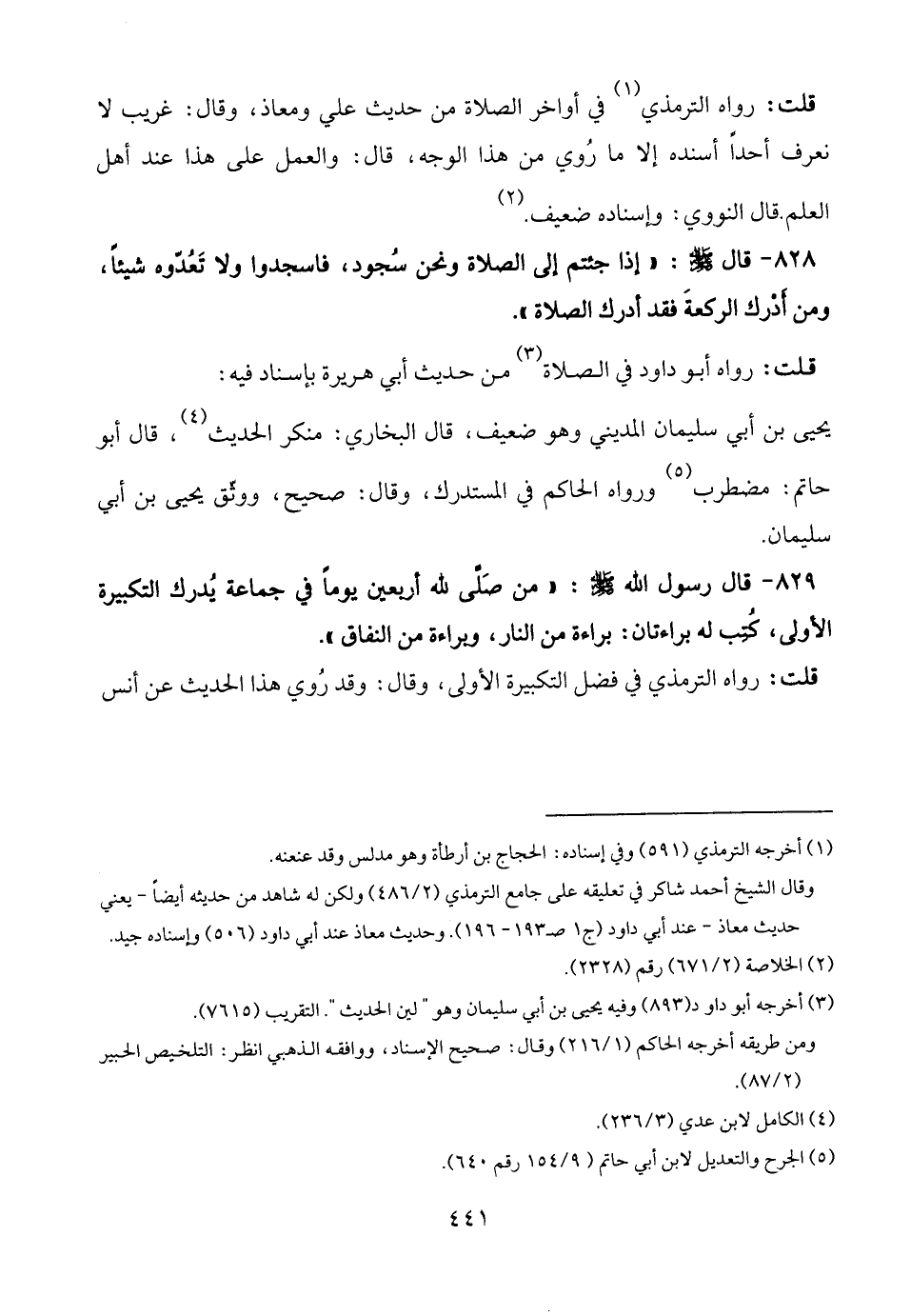 وقال الشيخ أحمد شاكر في تعليقه على جامع الترمذي (2/ 486) ولكن له شاهد من حديثه أيضًا -يعني حديث معاذ- عند أبي داود (ج 1 ص 193 - 196). وحديث معاذ عند أبي داود (506) وإسناده جيد.