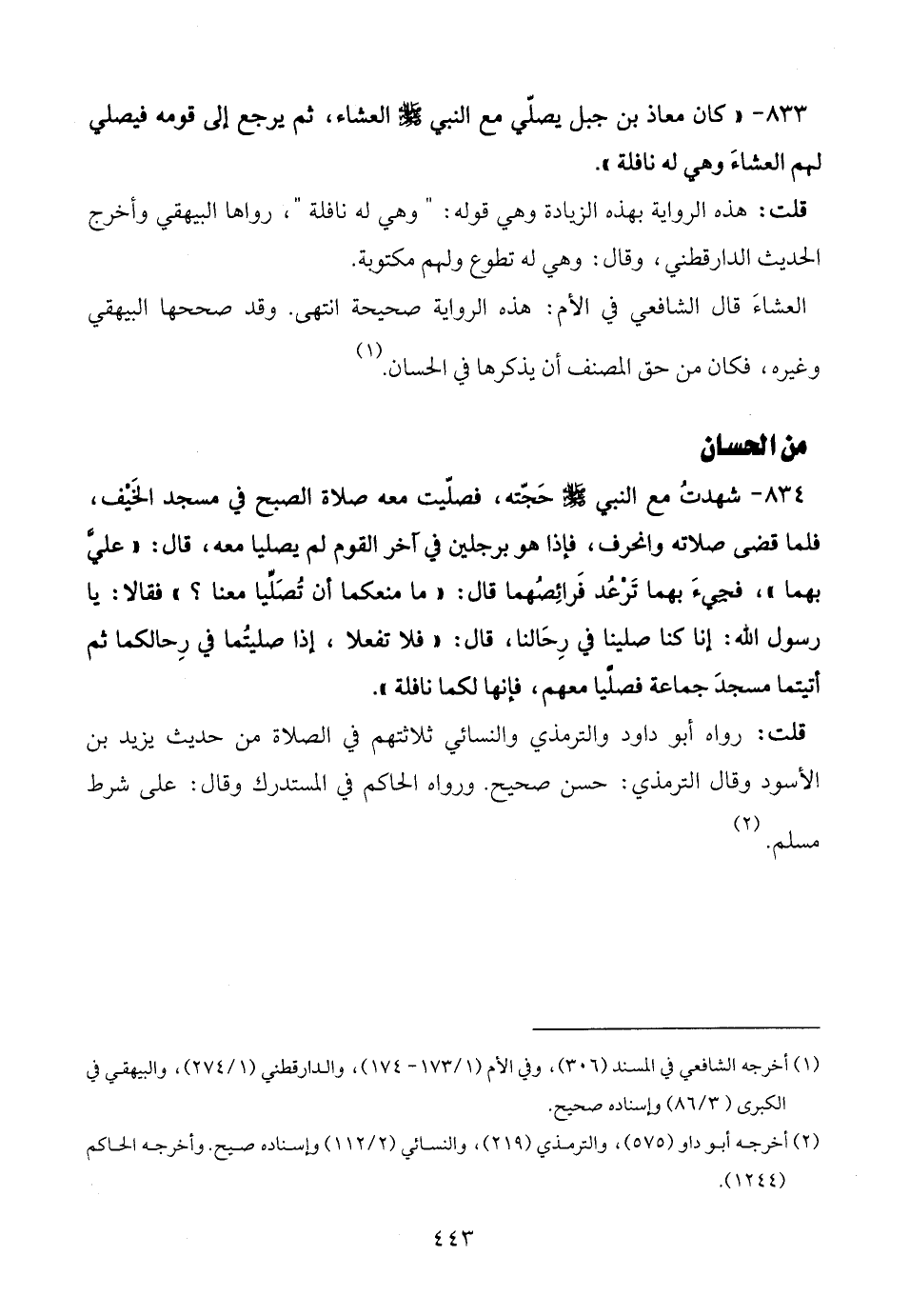 833 - "كان معاذ بن جبل يصلّي مع النبي - صلى الله عليه وسلم - العشاء، ثم يرجع إلى قومه فيصلي لهم العشاء وهي له نافلة".