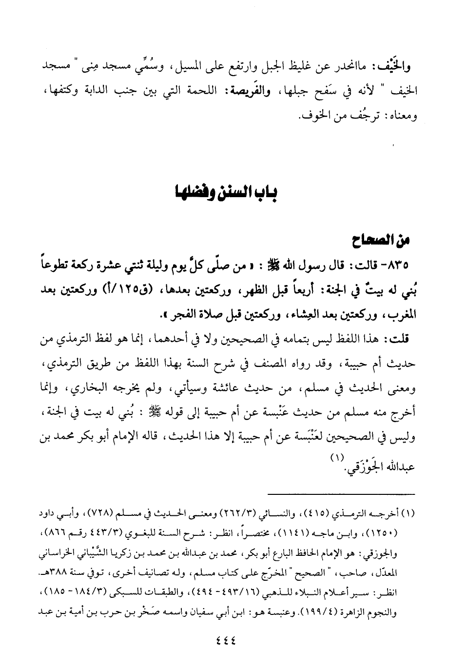 (¬1) أخرجه الترمذي (415)، والنسائي (3/ 262) ومعنى الحديث في مسلم (728)، وأبي داود (1250)، وابن ماجه (1141)، مختصرًا، انظر: شرح السنة للبغوي (3/ 443 رقم 866)، والجوزقي: هو الإمام الحافظ البارع أبو بكر، محمد بن عبد الله بن محمد بن زكريا الشَّيْباني الخراساني المعدّل، صاحب "الصحيح" المخرّج على كتاب مسلم، وله تصانيف أخرى، توفي سنة 388 هـ. انظر: سير أعلام النبلاء للذهبي (16/ 493 - 494)، والطبقات للسبكي (3/ 184 - 185)، والنجوم الزاهرة (4/ 199). وعنبسة هو: ابن أبي سفيان واسمه صَخْر بن حرب بن أمية بن عبد =