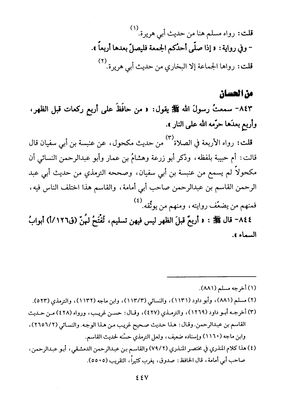 (¬4) هذا كلام المنذري في مختصر المنذري (2/ 79) والقاسم بن عبد الرحمن الدمشقي، أبو عبد الرحمن، صاحب أبي أمامة، قال الحافظ: صدوق، يغرب كثيرًا، التقريب (5505).