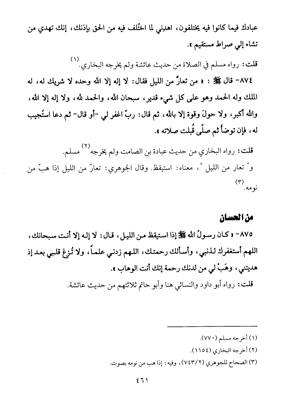 875 - " كان رسولُ الله - صلى الله عليه وسلم - إذا استيقظ من الليل، قال: لا إله إلا أنت سبحانك، اللهم أستغفرك لذنبي، وأسألك رحمتك، اللهم زدني علمًا، ولا تُزغ قلبي بعد إذ هديتني، وهَبْ لي من لدنك رحمة إنك أنت الوهاب".