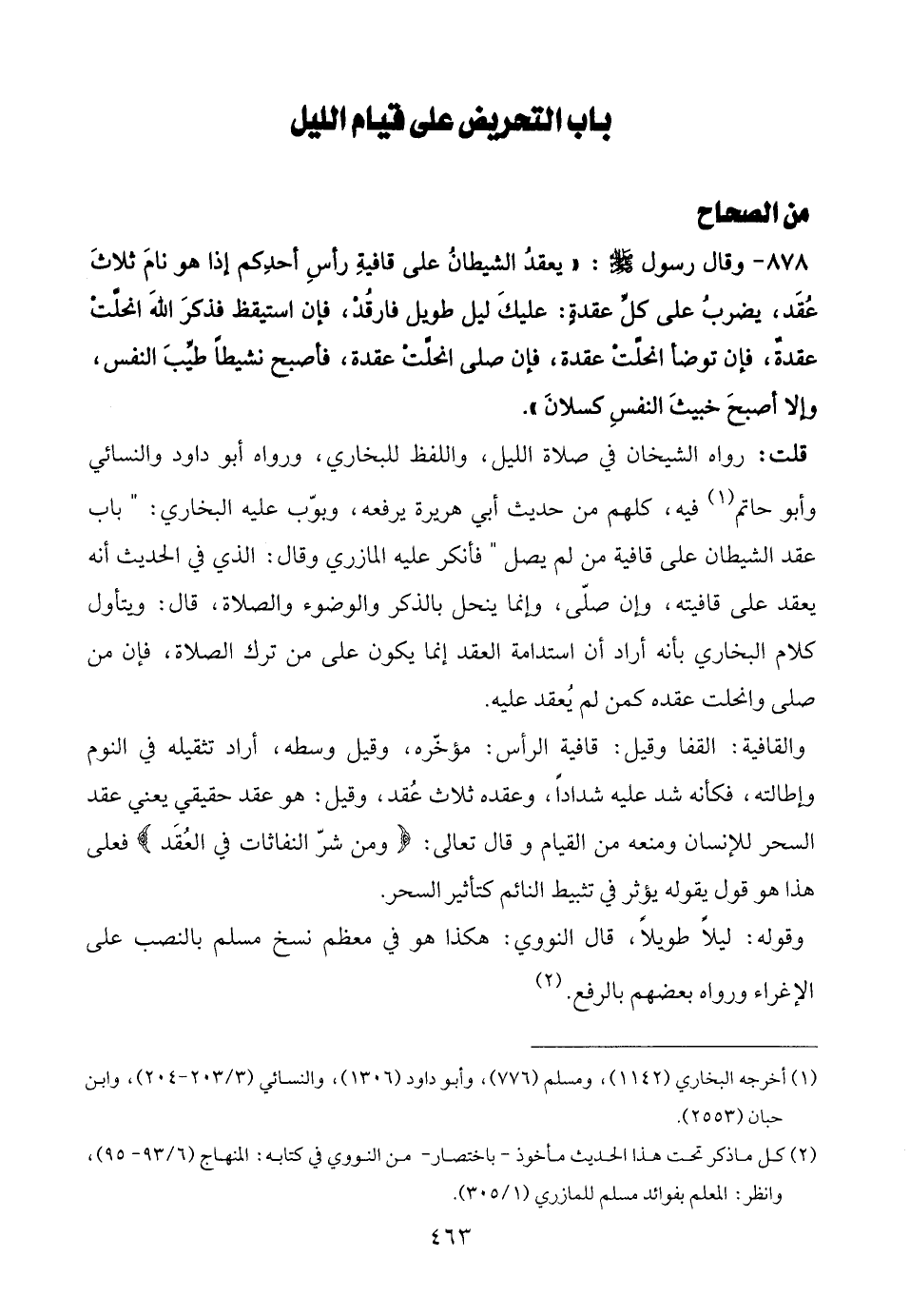 878 - وقال رسول - صلى الله عليه وسلم -: "يعقدُ الشيطانُ على قافيةِ رأسِ أحدِكم إذا هو نامَ ثلاثَ عُقَد، يضربُ على كلِّ عقدةٍ: عليكَ ليل طويل فارقُدْ، فإن استيقظ فذكرَ اللهَ انحلِّتْ عقدةٌ، فإن توضأ انحلِّتْ عقدة، فإن صلى انحلِّتْ عقدة، فأصبح نشيطًا طيِّبَ النفس، وإلا أصبحَ خبيثَ النفسِ كسلانَ".