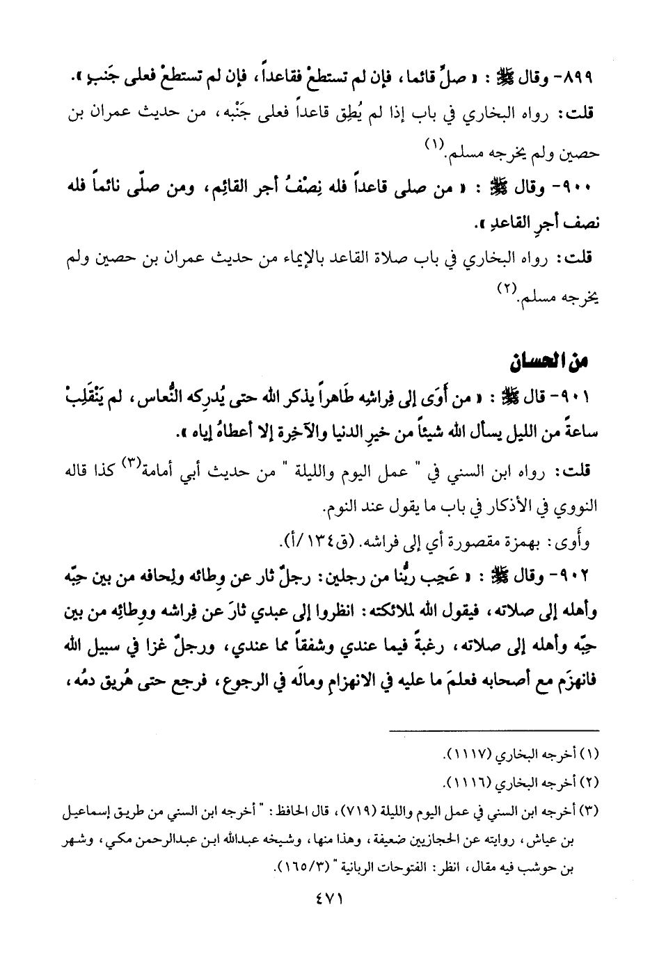 900 - وقال - صلى الله عليه وسلم -: "من صلى قاعدًا فله نِصْفُ أجر القائِم، ومن صلّى نائمًا فله نصف أجرِ القاعدِ".