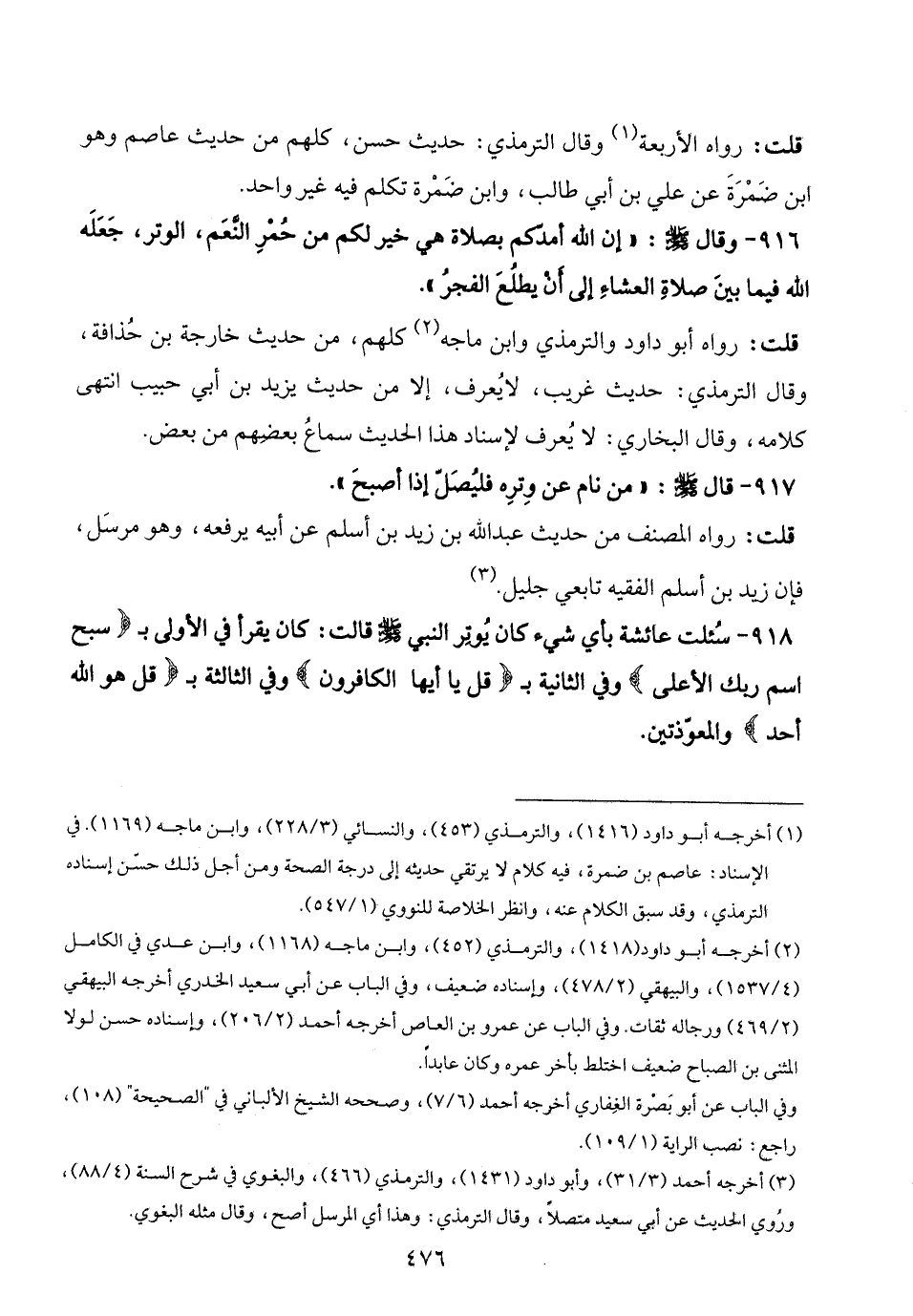 (¬1) أخرجه أبو داود (1416)، والترمذي (453)، والنسائي (3/ 228)، وابن ماجه (1169). في الإسناد: عاصم بن ضمرة، فيه كلام لا يرتقي حديثه إلى درجة الصحة ومن أجل ذلك حسّن إسناده الترمذي، وقد سبق الكلام عنه، وانظر الخلاصة للنووي (1/ 547).
