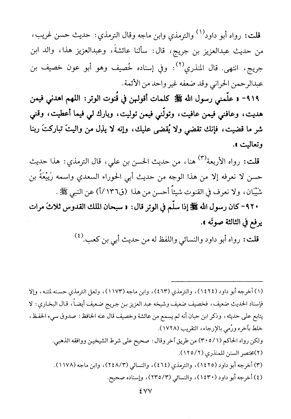 920 - كان رسول الله - صلى الله عليه وسلم - إذا سلّم في الوتر قال: "سبحان الملك القدوس ثلاثَ مرات يرفع في الثالثة صوتَه".