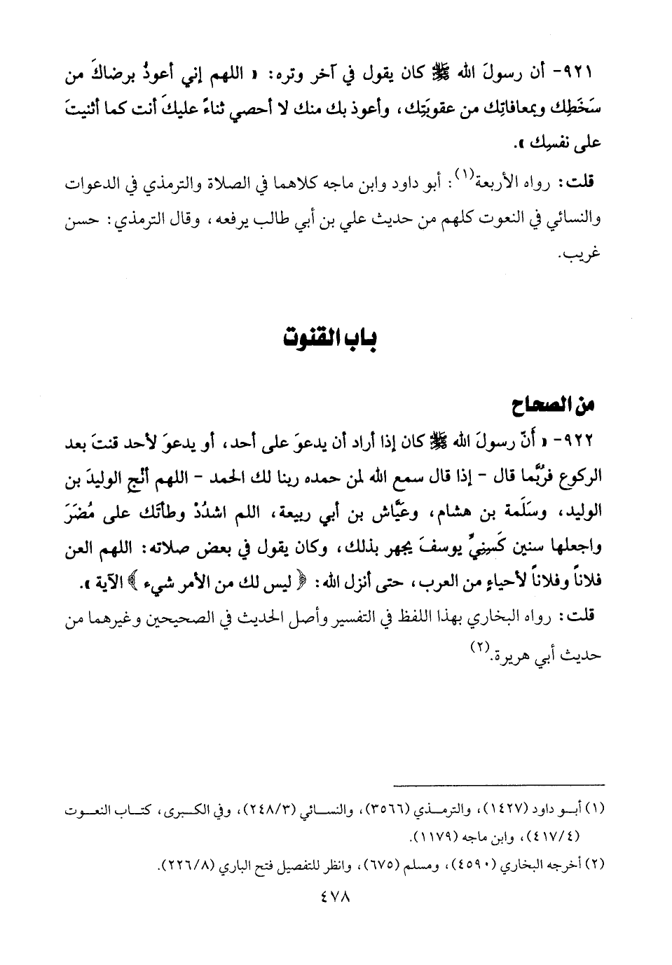 922 - " أنّ رسولَ الله - صلى الله عليه وسلم - كان إذا أراد أن يدعوَ على أحد، أو يدعوَ لأحد قنتَ بعد الركوع فرُبَّما قال -إذا قال سمع الله لمن حمده ربنا لك الحمد- اللهم أنْجِ الوليدَ بن الوليد، وسَلَمة بن هشام، وعيَّاش بن أبي ربيعة، اللم اشدُدْ وطأتك على مُضَرَ واجعلها سنين كَسنِيِّ يوسفَ يجهر بذلك، وكان يقول في بعض صلاته: اللهم العن فلانًا وفلانًا لأحياءٍ من العرب، حتى أنزل الله: {ليس لك من الأمر شيء} الآية".