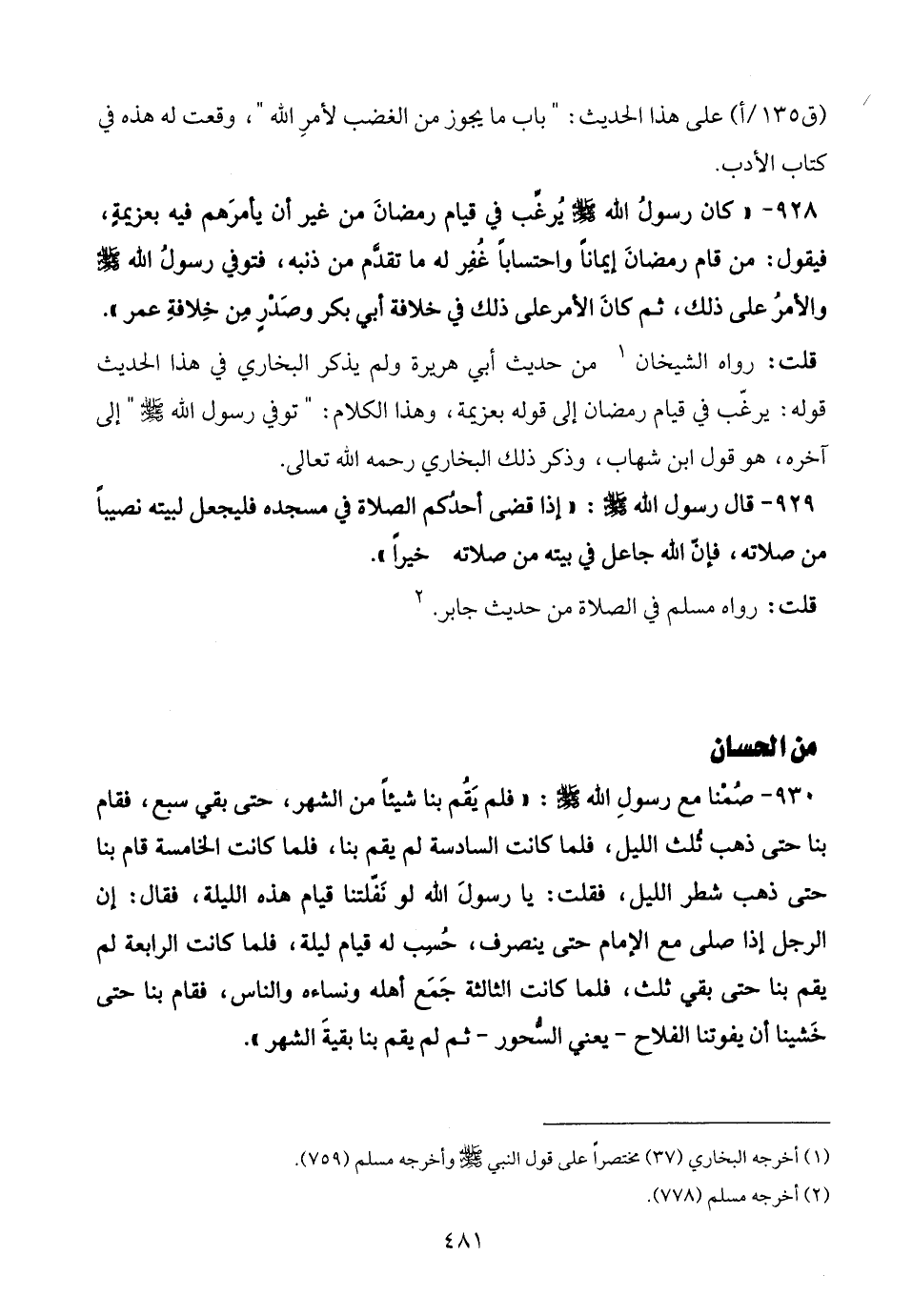 928 - "كان رسولُ الله - صلى الله عليه وسلم - يُرغِّب في قيام رمضانَ من غير أن يأمرَهم فيه بعزيمةٍ، فيقول: من قام رمضانَ إيمانًا واحتسابًا غُفِر له ما تقدّم من ذنبه، فتوفي رسولُ الله - صلى الله عليه وسلم - والأمرُ على ذلك، ثم كانَ الأمر على ذلك في خلافة أبي بكر وصَدْرٍ مِن خِلافةِ عمر".