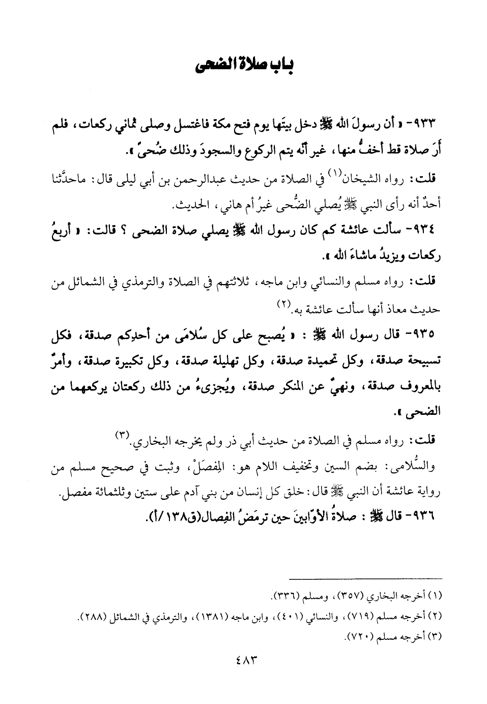 935 - قال رسول الله - صلى الله عليه وسلم -: "يُصبح على كل سُلامَى من أحدِكم صدقة، فكل تسبيحة صدقة، وكل تحميدة صدقة، وكل تهليلة صدقة، وكل تكبيرة صدقة، وأمرٌ بالمعروف صدقة، ونهيٌ عن المنكر صدقة، ويُجزىءُ من ذلك ركعتان يركعهما من الضحى".