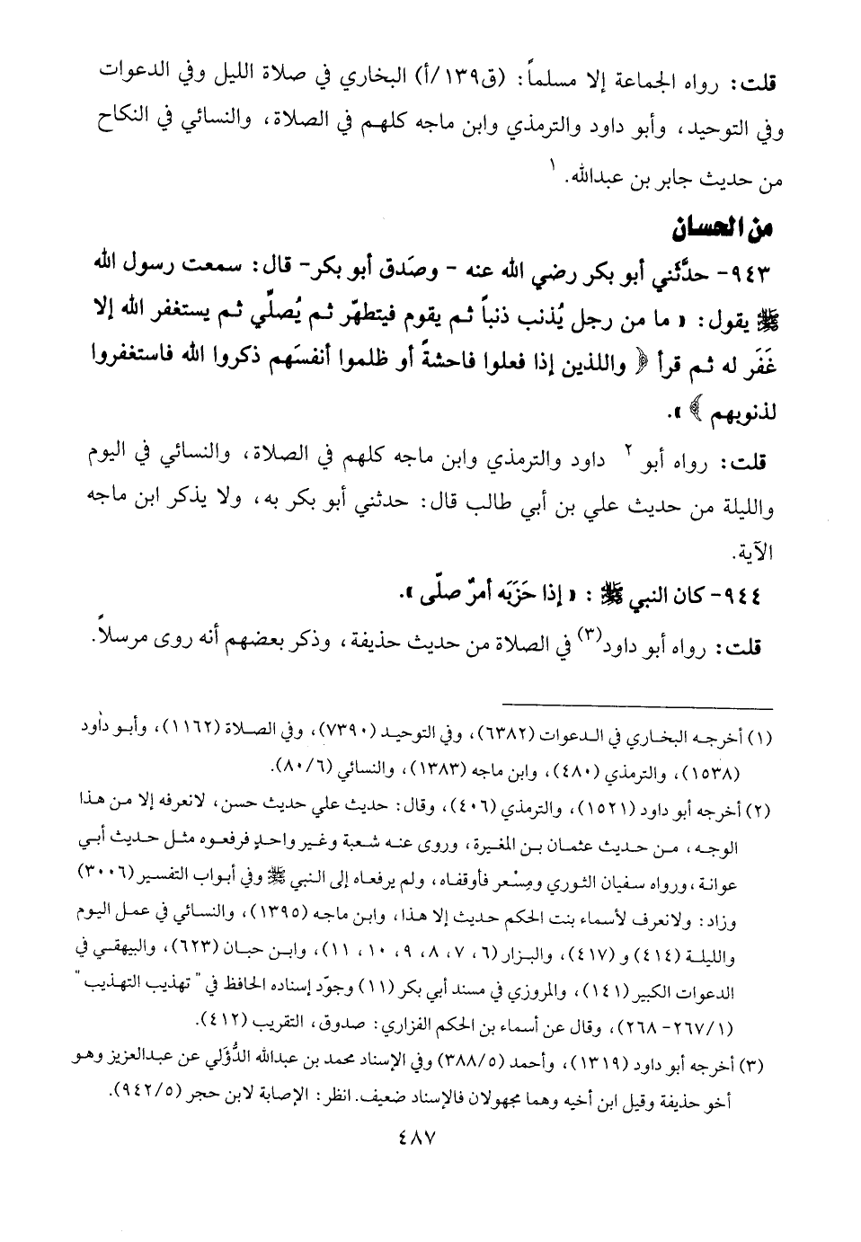 943 - حدّثني أبو بكر رضي الله عنه -وصَدق أبو بكر- قال: سمعت رسول الله - صلى الله عليه وسلم - يقول: "ما من رجل يُذنب ذنبًا ثم يقوم فيتطهّر ثم يُصلّي ثم يستغفر الله إلا غَفَر له ثم قرأ {والذين إذا فعلوا فاحشةً أو ظلموا أنفسَهم ذكروا الله فاستغفروا لذنوبهم} ".