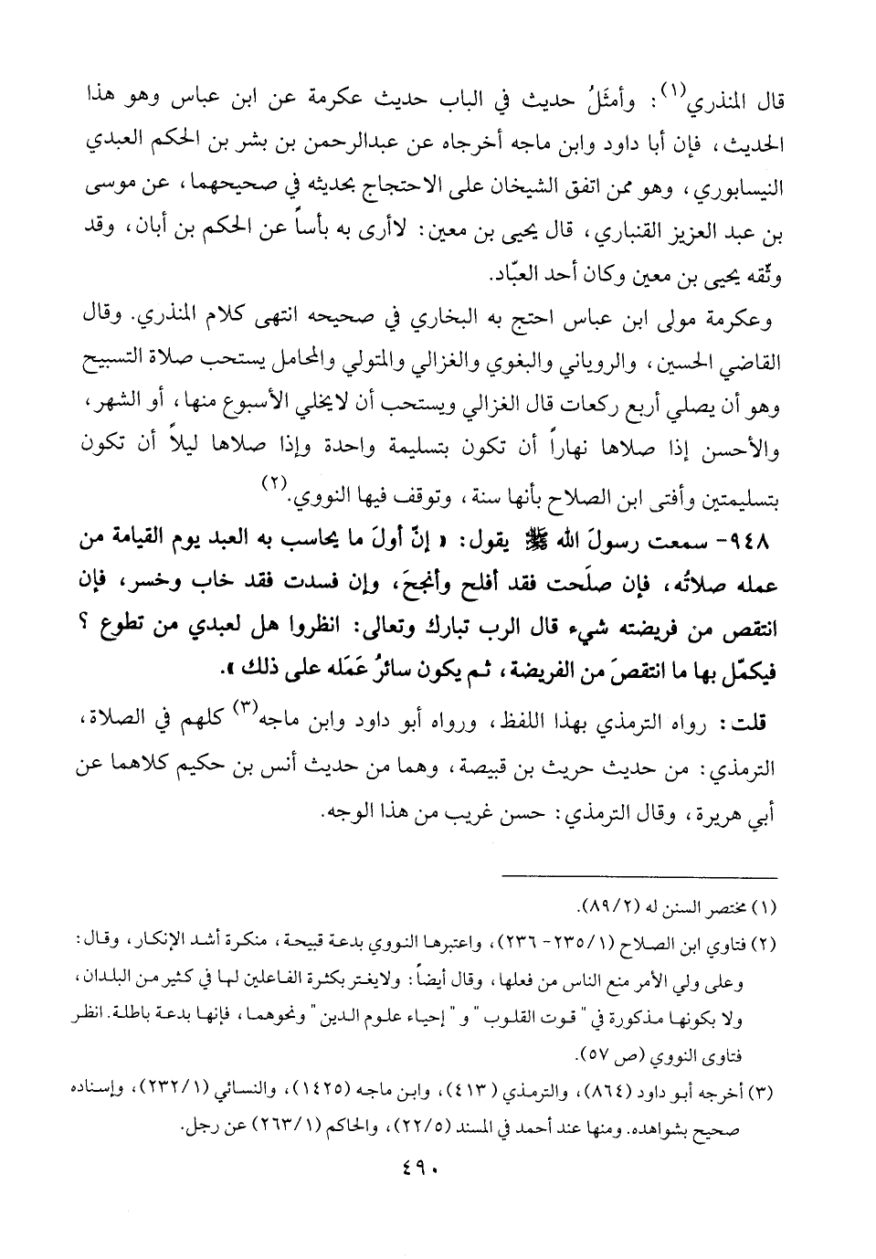 وعكرمة مولى ابن عباس احتج به البخاري في صحيحه انتهى كلام المنذري. وقال القاضي الحسين، والروياني والبغوي والغزالي والمتولي والمحامل يستحب صلاة التسبيح وهو أن يصلي أربع ركعات قال الغزالي ويستحب أن لا يخلي الأسبوع منها، أو الشهر، والأحسن إذا صلاها نهارًا أن تكون بتسليمة واحدة وإذا صلاها ليلًا أن تكون بتسليمتين وأفتى ابن الصلاح بأنها سنة، وتوقف فيها النووي. (¬2)