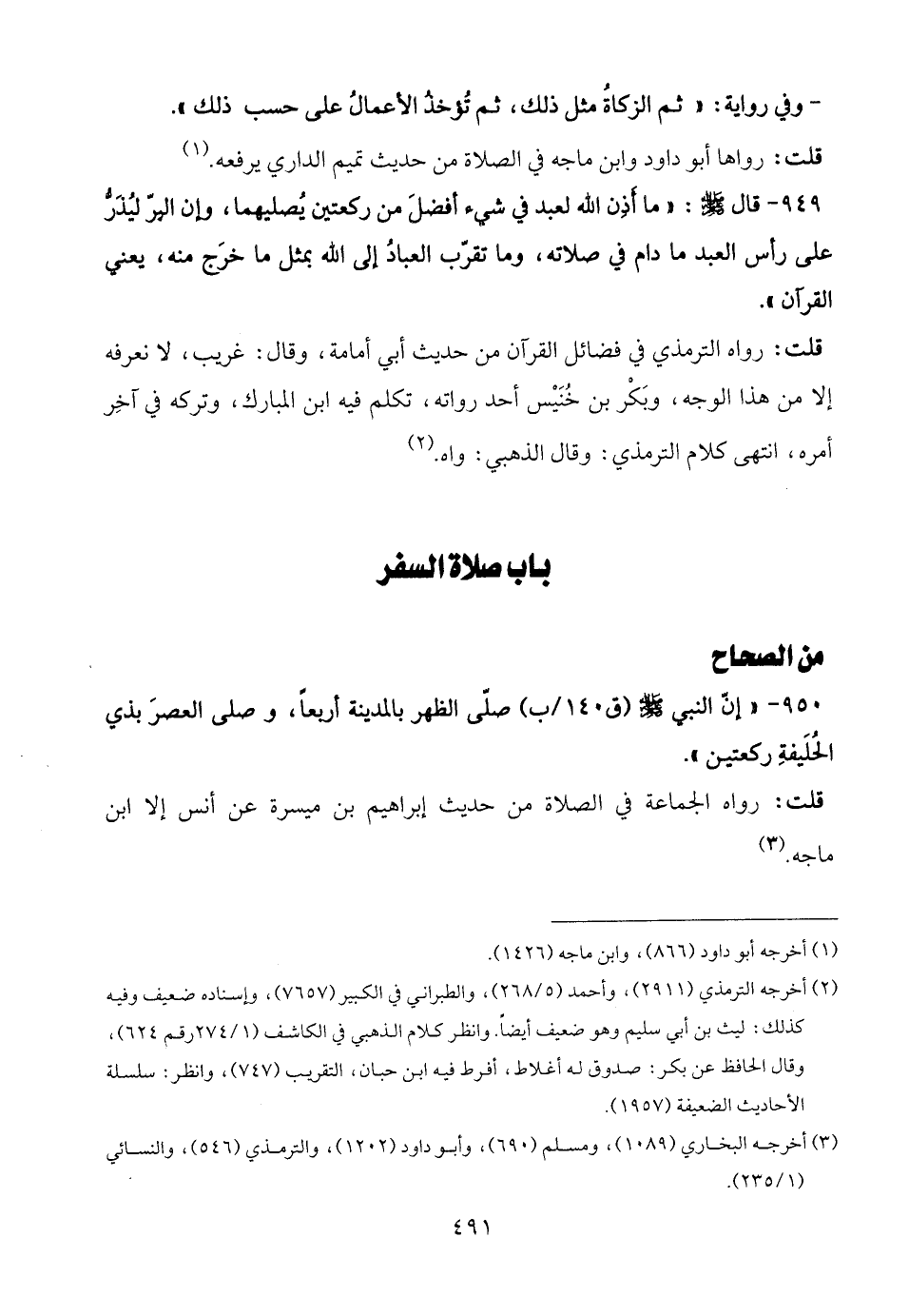 950 - " إنّ النبي - صلى الله عليه وسلم - صلّى الظهر بالمدينة أربعًا، وصلى العصرَ بذي الحُلَيفةِ ركعتين".