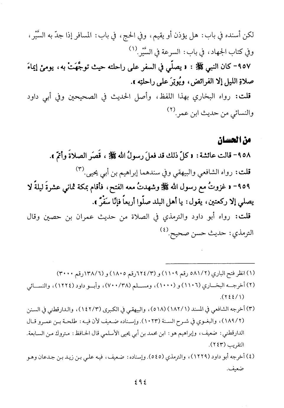 959 - "غزوتُ مع رسول الله - صلى الله عليه وسلم - وشهدتُ معه الفتح، فأقام بمكة ثماني عشرةَ ليلةً لا يصلي إلا ركعتين، يقول: يا أهل البلد صلّوا أربعًا فإنّا سَفْرٌ".