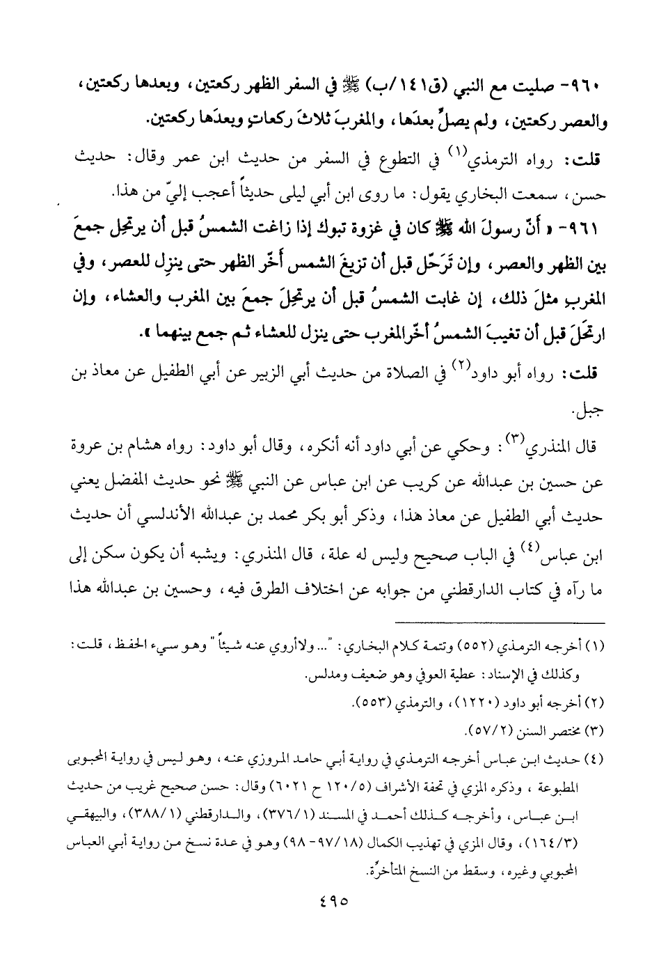 961 - "أَنّ رسولَ الله - صلى الله عليه وسلم - كان في غزوة تبوك إذا زاغت الشمسُ قبل أن يرتحِل جمعَ بين الظهر والعصر، كان تَرَحّل قبل أن تزيغَ الشمس أَخّر الظهر حتى ينزِل للعصر، وفي المغرب مثلَ ذلك، إن غابت الشمسُ قبل أن يرتحِلَ جمعَ بين المغرب والعشاء، وإن ارتحَلَ قبل أن تغيبَ الشمسُ أخّر المغرب حتى ينزل للعشاء ثم جمع بينهما".
