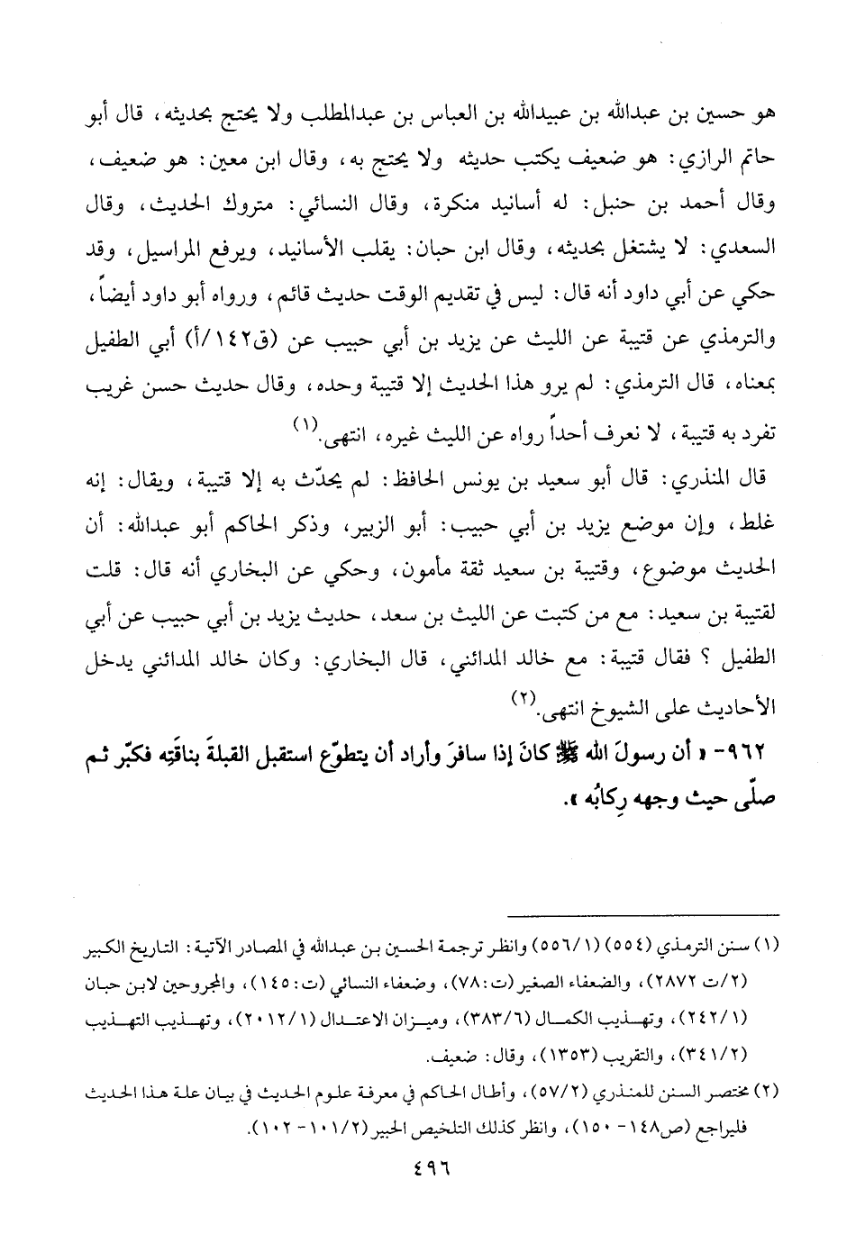 962 - "أن رسولَ الله - صلى الله عليه وسلم - كانَ إذا سافرَ وأراد أن يتطوّع استقبل القبلةَ بناقَتِه فكبّر ثم صلّى حيث وجهه رِكابُه".