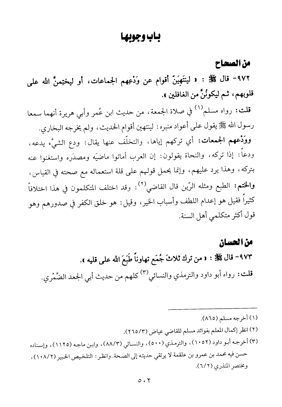 973 - قال - صلى الله عليه وسلم -: "من ترك ثلاثَ جُمَع تهاونًا طَبَعَ الله على قلبه".