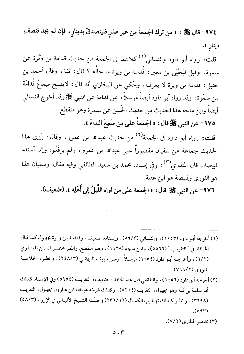 (¬2) أخرجه أبو داود (1056)، والطائفي قال عنه الحافظ: ضعيف، التقريب (5954) وفي الإسناد كذلك أبو سلمة بن نُبَيْه وهو مجهول، التقريب (8204)، وكذلك شيخه عبد الله ابن هارون مجهول، التقريب (3698)، وانظر كذلك تهذيب الكمال (16/ 236) وحسَّنه الشيخ الألباني في الإرواء (3/ 58) (593).