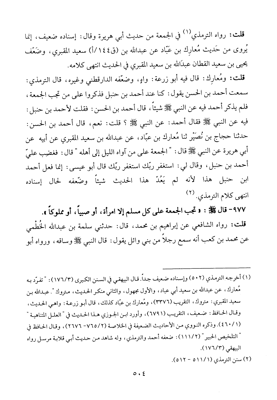 قلت: ومُعارِك: قال فيه أبو زرعة: واهٍ، وضعّفه الدارقطني وغيره، قال الترمذي: سمعت أحمد بن الحسن يقول: كنا عند أحمد بن حنبل فذكروا على من تجب الجمعة، فلم يذكر أحمد فيه عن النبي - صلى الله عليه وسلم - شيئًا، قال أحمد بن الحسن: فقلت لأحمد بن حنبل: فيه عن النبي - صلى الله عليه وسلم - فقال أحمد: عن النبي - صلى الله عليه وسلم -؟ قلت: نعم، قال أحمد بن الحسن: حدثنا حجاج بن نُصَيْر ثنا مُعارك بن عبّاد، عن عبد الله بن سعيد المقبري عن أبيه عن أبي هريرة عن النبي - صلى الله عليه وسلم - قال: "الجمعة على من آواه الليل إلى أهله" قال: فغضِب عليّ أحمد بن حنبل، وقال لي: استغفر ربّك استغفر ربّك قال أبو عيسى: إنما فعل أحمد ابن حنبل هذا لأنه لم يَعُدّ هذا الحديث شيئًا وضعّفه لحال إسناده انتهى كلام الترمذي. (¬2)