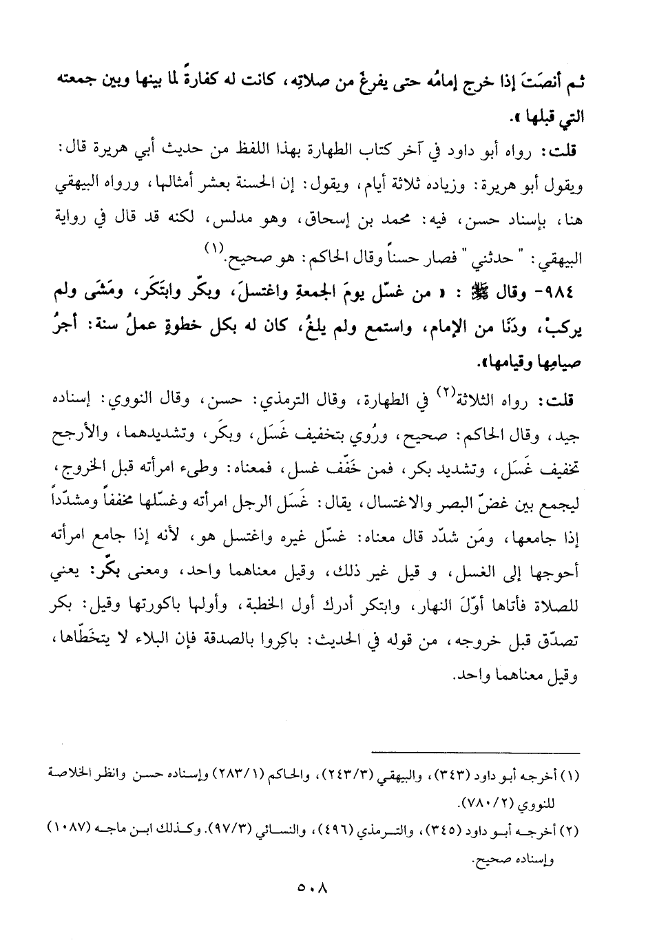 قلت: رواه الثلاثة (¬2) في الطهارة، وقال الترمذي: حسن، وقال النووي: إسناده جيد، وقال الحاكم: صحيح، ورُوي بتخفيف غَسَل، وبكَر، وتشديدهما، والأرجح تخفيف غَسَل، وتشديد بكر، فمن خَفّف غسل، فمعناه: وطىء امرأته قبل الخروج، ليجمع بين غضّ البصر والاغتسال، يقال: غَسَل الرجل امرأته وغسّلها مخففًا ومشدّدًا إذا جامعها، ومَن شدّد قال معناه: غسّل غيره واغتسل هو، لأنه إذا جامع امرأته أحوجها إلى الغسل، وقيل غير ذلك، وقيل معناهما واحد، ومعنى بكّر: يعني للصلاة فأتاها أوّلَ النهار، وابتكر أدرك أول الخطبة، وأولها باكورتها وقيل: بكر تصدّق قبل خروجه، من قوله في الحديث: باكِروا بالصدقة فإن البلاء لا يتخَطّاها، وقيل معناهما واحد.