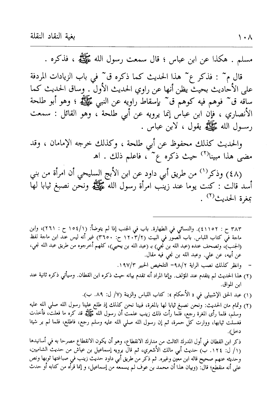(48) وذكر (¬1) من طريق أبي داود عن ابن الأبج السليحي أن امرأة من بني أسد قالت: كنت يوما عند زينب امرأة رسول الله - صلى الله عليه وسلم - ونحن نصبغ ثيابا لها بمغرة الحديث (¬2).