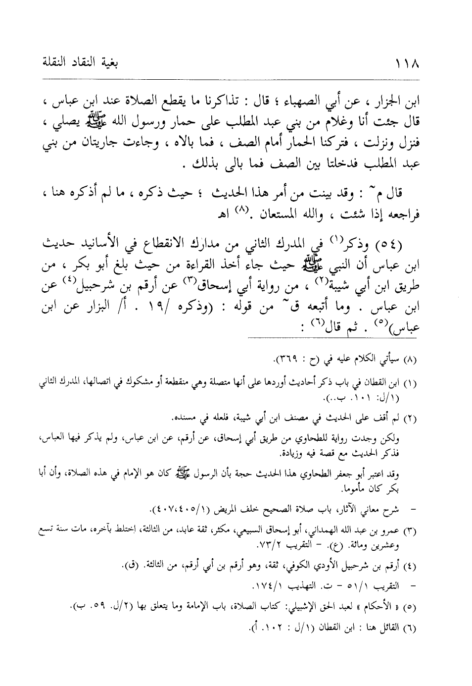 (54) وذكر (¬1) في المدرك الثاني من مدارك الإنقطاع في الأسانيد حديث ابن عباس أن النبي - صلى الله عليه وسلم - حيث جاء أخذ القراءة من حيث بلغ أبو بكر، من طريق ابن أبي شيبة (¬2)، من رواية أبي إسحاق (¬3) عن أرقم بن شرحبيل (¬4) عن ابن عباس. وما أتبعه ق من قوله: (وذكره / 19. أ/ البزار عن ابن عباس) (¬5). ثم قال (¬6):