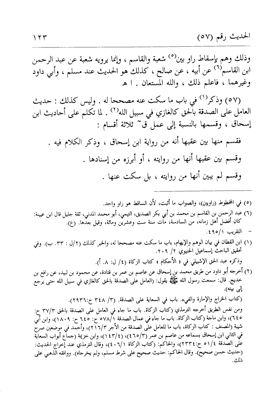 (57) وذكر (¬1) في باب ما سكت عنه مصححا له. وليس كذلك: حديث العامل على الصدقة بالحق كالغازي في سبيل الله (¬2). لما تكلم على أحاديث ابن إسحاق، وقسمها بالنسبة إلى عمل ق ثلاثة أقسام: