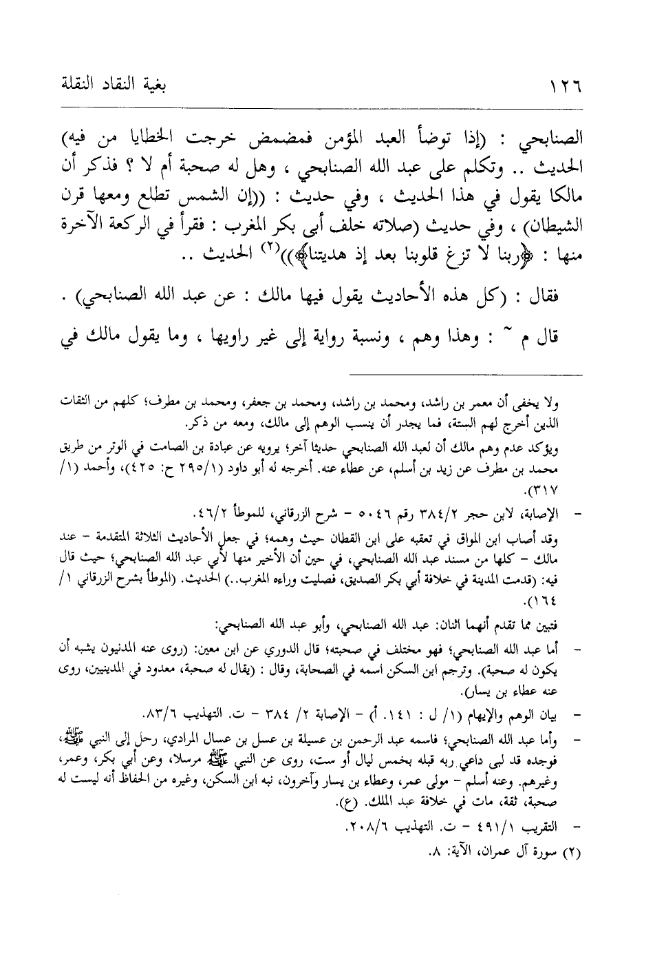 الصنابحي: (إذا توضأ العبد المؤمن فمضمض خرجت الخطايا من فيه) الحديث .. وتكلم على عبد الله الصنابحي، وهل له صحبة أم لا؟ فذكر أن مالكا يقول في هذا الحديث، وفي حديث: ((إن الشمس تطلع ومعها قرن الشيطان)، وفي حديث (صلاته خلف أبي بكر الغرب: فقرأ في الركعة الآخرة منها: {رَبَّنَا لَا تُزِغْ قُلُوبَنَا بَعْدَ إِذْ هَدَيْتَنَا})) (¬2) الحديث ..