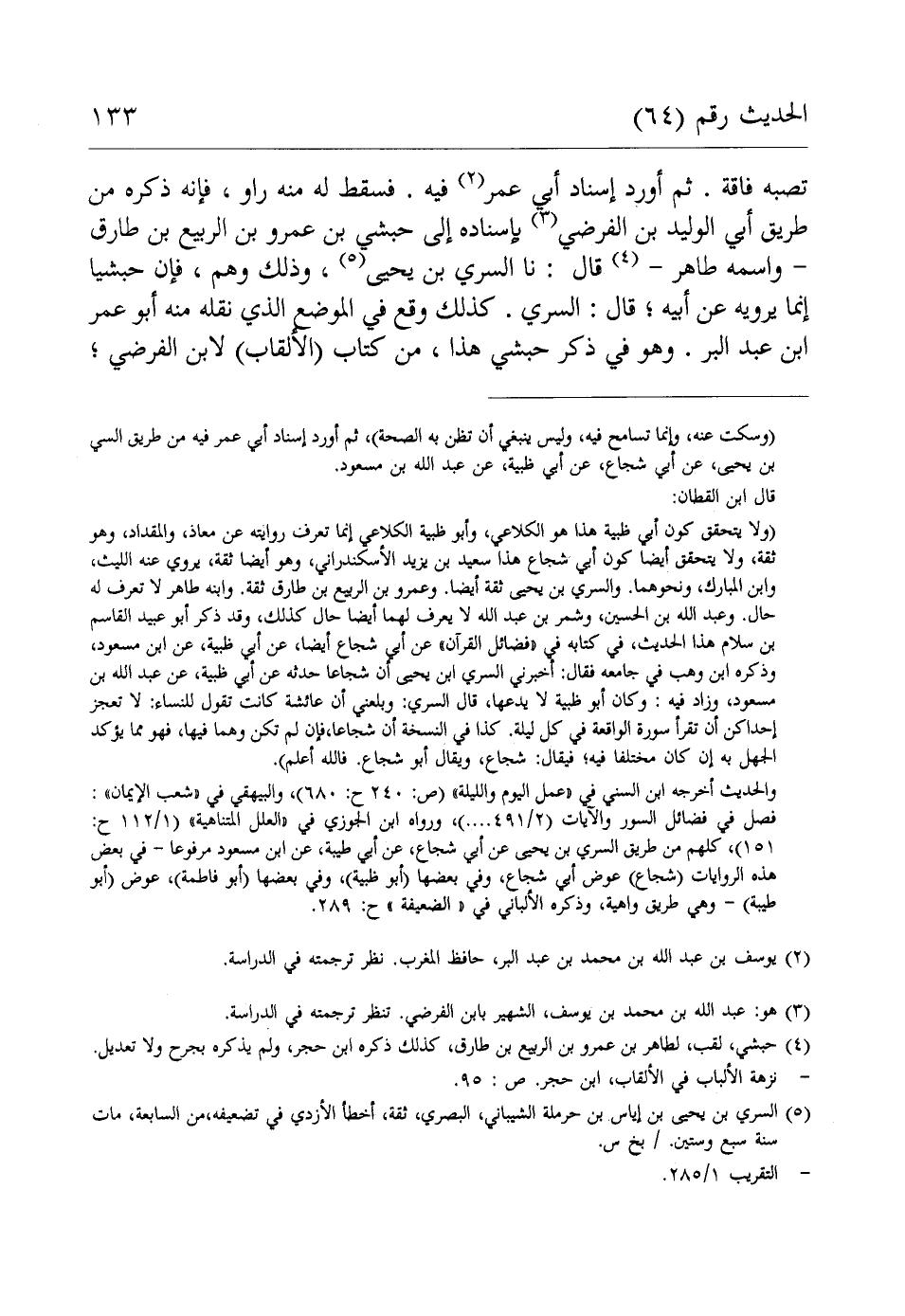 (وسكت عنه، وإنما تسامح فيه، وليس ينبغي أن تظن به الصحة)، ثم أورد إسناد أبي عمر فيه من طريق السي بن يحيى، عن أبي شجاع، عن أبي ظبية، عن عبد الله بن مسعود.