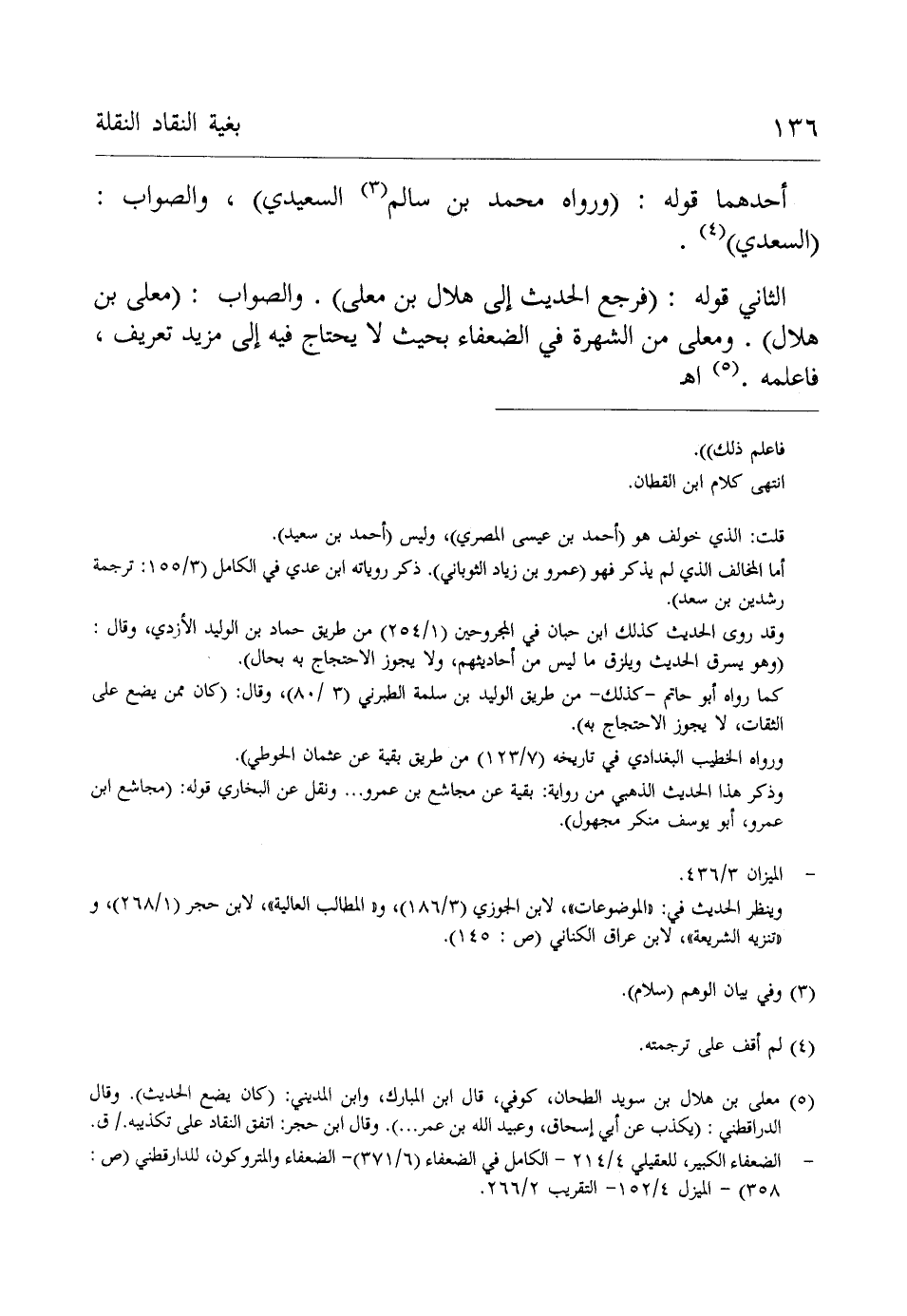 الثاني قوله: (فرجع الحديث إلى هلال بن معلى). والصواب: (معلى بن هلال). ومعلى من الشهرة في الضعفاء بحيث لا يحتاج فيه إلى مزيد تعريف، فاعلمه. (¬5) اهـ