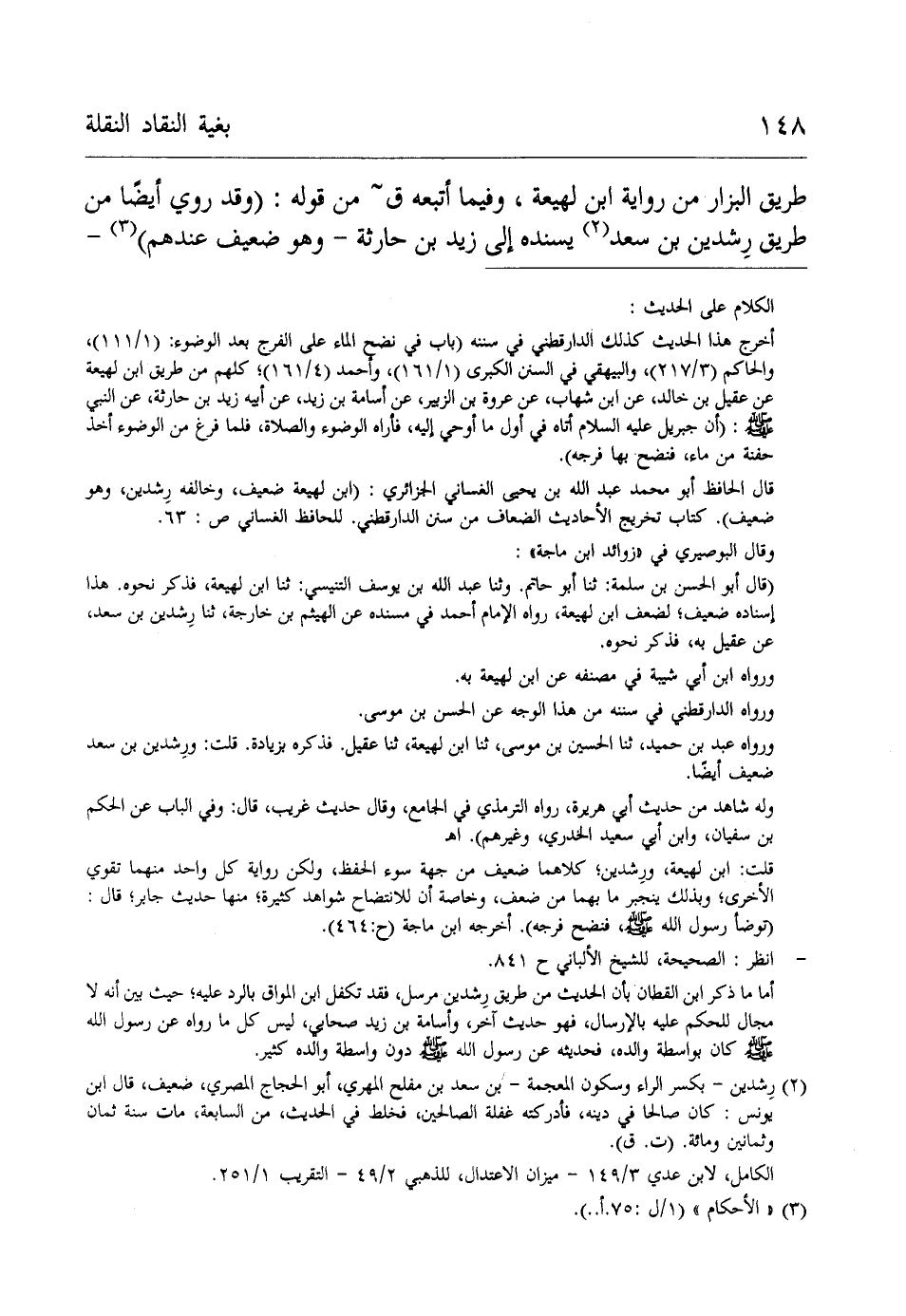 قال الحافظ أبو محمد عبد الله بن يحيى النسائي الجزائري: (ابن لهيعة ضعيف، وخالفه رِشدين، وهو ضعيف). كتاب تخريج الأحادث الضعاف من سنن الدارقطني. للحافظ الغساني ص: 63.
