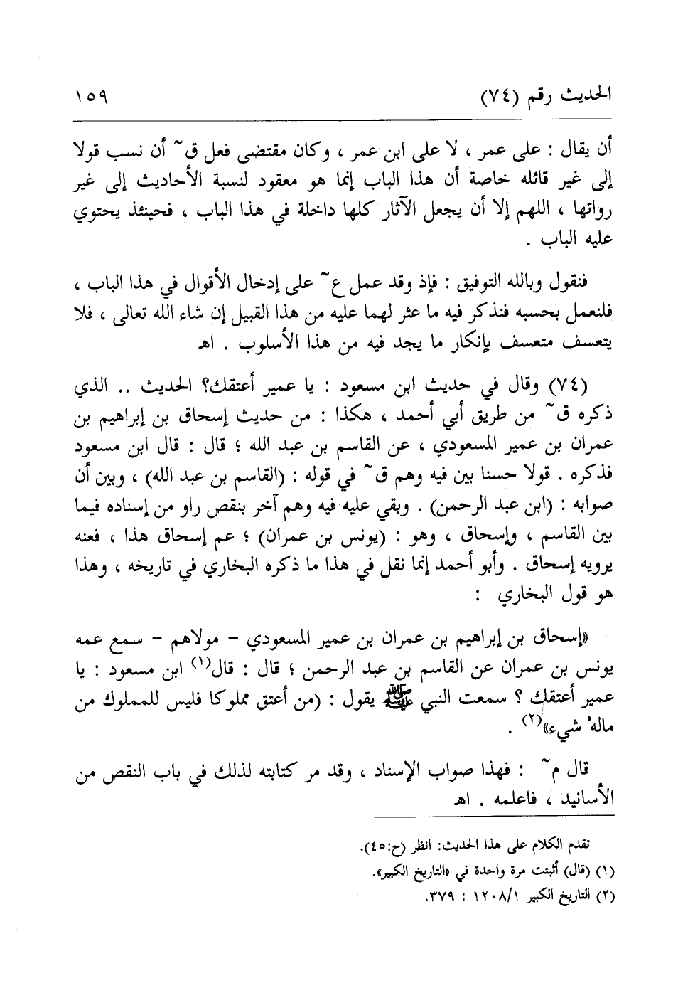 (74) وقال في حديث ابن مسعود: يا عمير أعتقك؟ الحديث .. الذي ذكره ق من طريق أبي أحمد، هكذا: من حديث إسحاق بن إبراهيم بن عمران بن عمير المسعودي، عن القاسم بن عبد الله، قال: قال ابن مسعود فذكره. قولا حسنا بين فيه وهم ق في قوله: (القاسم بن عبد الله)، وبين أن صوابه: (ابن عبد الرحمن). وبقي عليه فيه وهم آخر بنقص راو من إسناده فيما بين القاسم، وإسحاق، وهو: (يونس بن عمران)؛ عم إسحاق هذا، فعنه يرويه إسحاق. وأبو أحمد إنما نقل في هذا ما ذكره البخاري في تاريخه، وهذا هو قول البخاري: