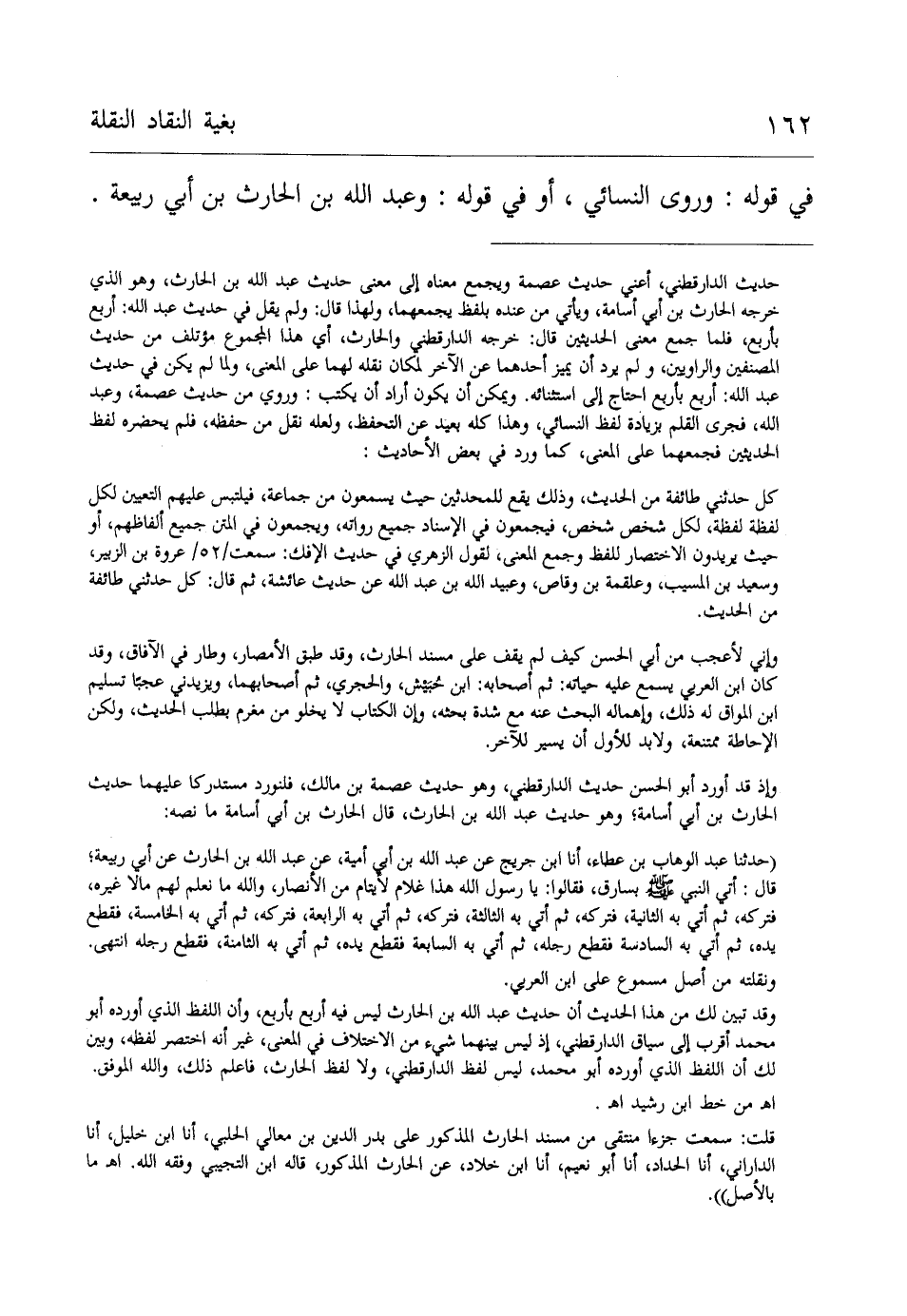 حديث الدارقطني، أعني حديث عصمة ويجمع معناه الى معنى حديث عبد الله بن الحارث، وهو الذي خرجه الحارث بن أبي أسامة، ويأتي من عنده بلفظ يجمعهما، ولهذا قال: ولم يقل في حديث عبد الله: أربع بأربع، فلما جمع معنى الحديثين قال: خرجه الدارقطني والحارث، أى هذا المجموع مؤتلف من حديث المصنفين والراويين، ولم يرد أن يميز أحدهما عن الآخر لمكان نقله لهما على المعنى، ولما لم يكن في حديث عبد الله: أربع بأربع احتاج الى استثنائه. ويمكن أن يكون أراد أن كتب: وروي من حديث عصمة، وعبد الله، فجرى القلم بزيادة لفظ النسائي، وهذا كله بعيد عن التحفظ، ولعله نقل من حفظه، فلم يحضره لفظ الحديثين فجمعهما على المعنى، كما ورد في بعض الأحاديث: