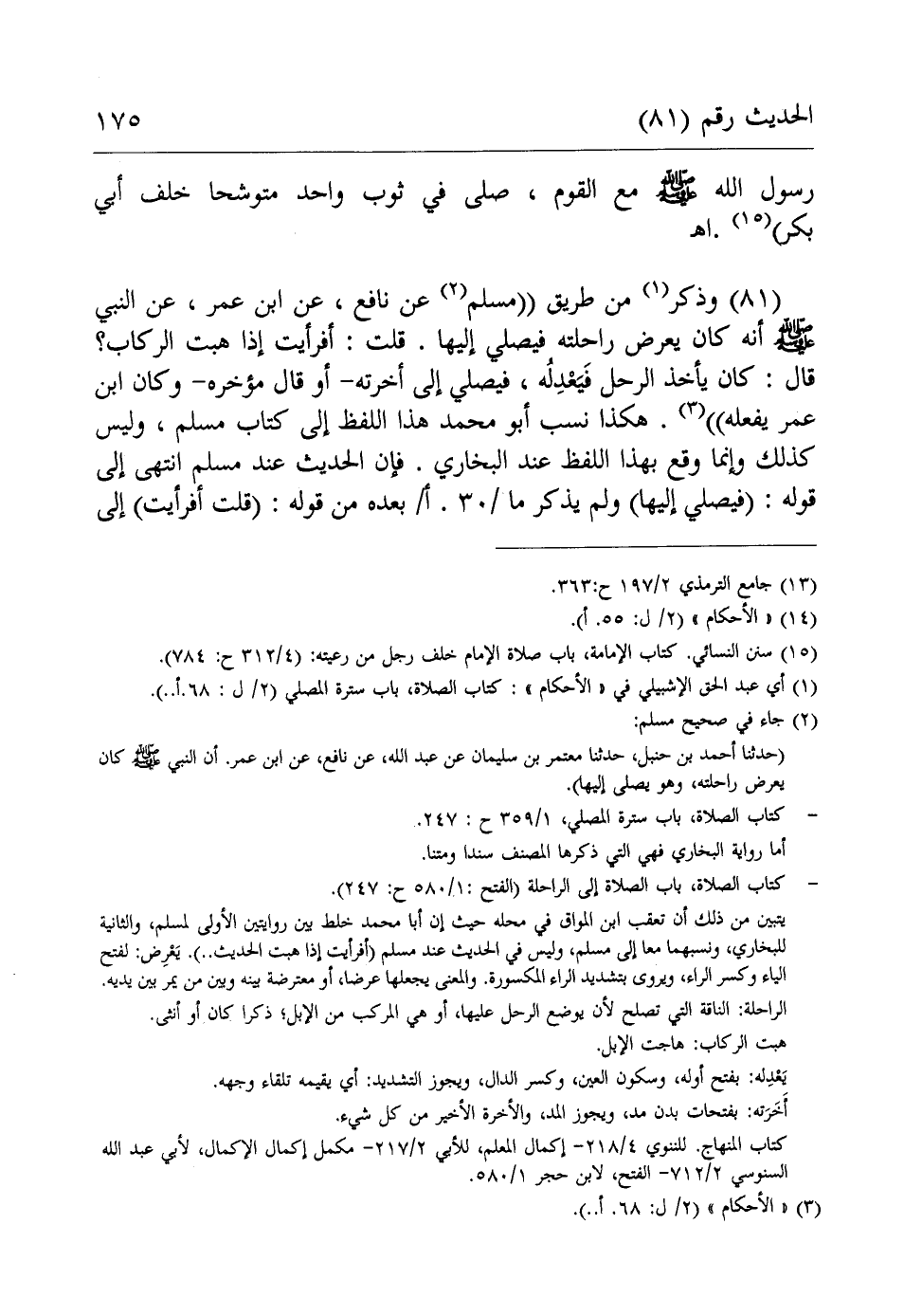 (81) وذكر (¬1) من طريق ((مسلم (¬2) عن نافع، عن ابن عمر، عن النبي - صلى الله عليه وسلم - أنه كان يعرض راحلته فيصلي إليها. قلت: أفرأيت إذا هبت الركاب؟ قال: كان يأخذ الرحل فَيَعْدِلُه، فيصلي إلى أخرته -أو قال مؤخره- وكان ابن عمر يفعله)) (¬3). هكذا نسب أبو محمد هذا اللفظ إلى كتاب مسلم، وليس كذلك وإنما وقع بهذا اللفظ عند البخاري. فإن الحديث عند مسلم انتهى إلى قوله: (فيصلي إليها) ولم يذكر ما/ 30. أ/ بعده من قوله: (قلت أفرأيت) إلى