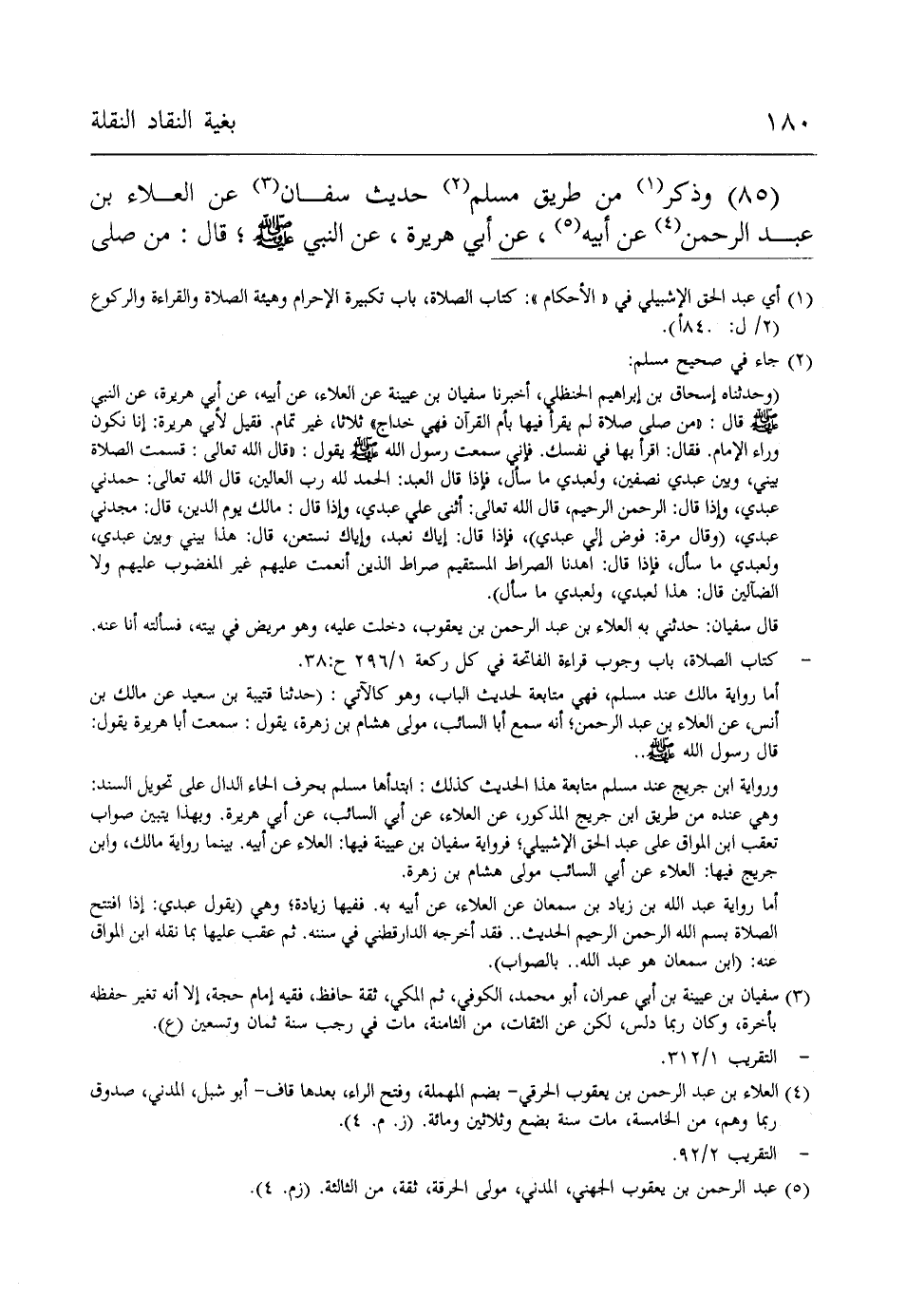 (85) وذكر (¬1) من طريق مسلم (¬2) حديث سفان (¬3) عن العلاء بن عبد الرحمن (¬4) عن أبيه (¬5)، عن أبي هريرة، عن النبي - صلى الله عليه وسلم -؛ قال: من صلى
