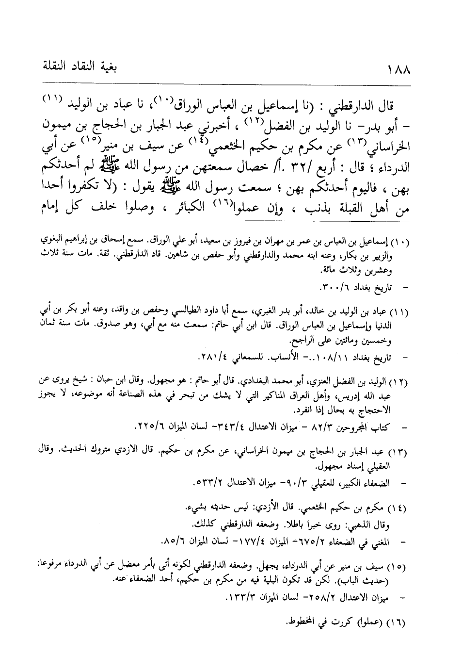 قال الدارقطني: (نا إسماعيل بن العباس الوراق (¬10)، نا عباد بن الوليد (¬11) -أبو بدر- نا الوليد بن الفضل (¬12)، أخبرني عبد الجبار بن الحجاج بن ميمون الخراساني (¬13) عن مكرم بن حكيم الخثعمي (¬14) عن سيف بن منير (¬15) عن أبي الدرداء؛ قال: أربع / 32. أ/ خصال سمعتهن من رسول الله - صلى الله عليه وسلم - لم أحدثكم بهن، فاليوم أحدثكم بهن، سمعت رسول الله - صلى الله عليه وسلم - يقول: (لا تكفروا أحدا من أهل القبلة بذنب، وإن عملوا (¬16) الكبائر، وصلوا خلف كل إمام