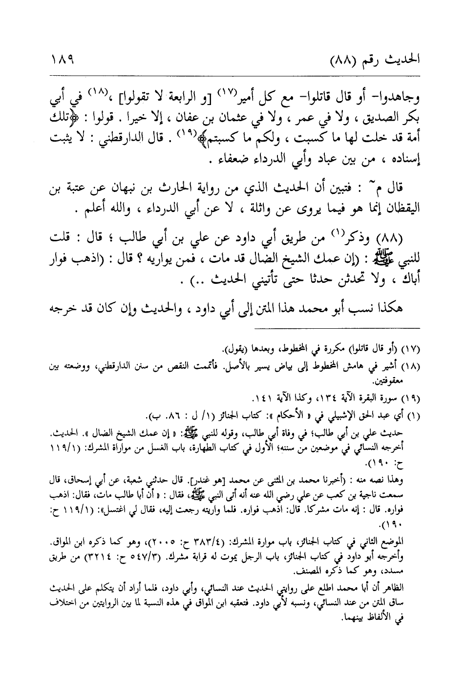 (88) وذكر (¬1) من طريق أبي داود عن علي بن أبي طالب، قال: قلت للنبي - صلى الله عليه وسلم -: (إن عمك الشيخ الضال قد مات، فمن يواريه؟ قال: (اذهب فوار أباك، ولا تحدثن حدثا حتى تأتيني الحديث ..).