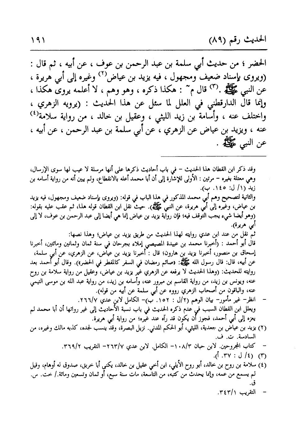 الحضر؛ من حديث أبي سلمة بن عبد الرحمن بن عوف، عن أبيه، ثم قال: (ويروى بإسناد ضعيف ومجهول، فيه يزيد بن عياض (¬2) وغيره إلى أبي هريرة، عن النبي - صلى الله عليه وسلم -. (¬3) قال م: هكذا ذكره، وهو وهم، لا أعلمه يروى هكذا، وإنما قال الدارقطني في العلل لما سئل عن هذا الحديث: (يرويه الزهري، واختلف عنه، وأسامة بن زيد الليثي، وعقيل بن خالد، من رواية سلامة (¬4) عنه، ويزيد بن عياض عن الزهري، عن أبي سلمة بن عبد الرحمن، عن أبيه، عن النبي - صلى الله عليه وسلم -.