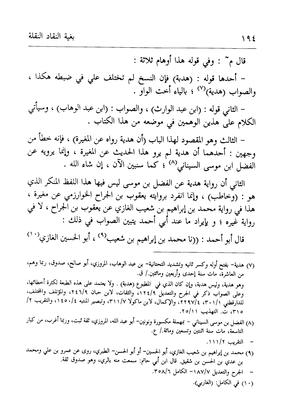 - الثاني قوله: (ابن عبد الوارث)، والصواب: (ابن عبد الوهاب)، وسيأتي الكلام على هذين الوهمين في موضعه من هذا الكتاب.