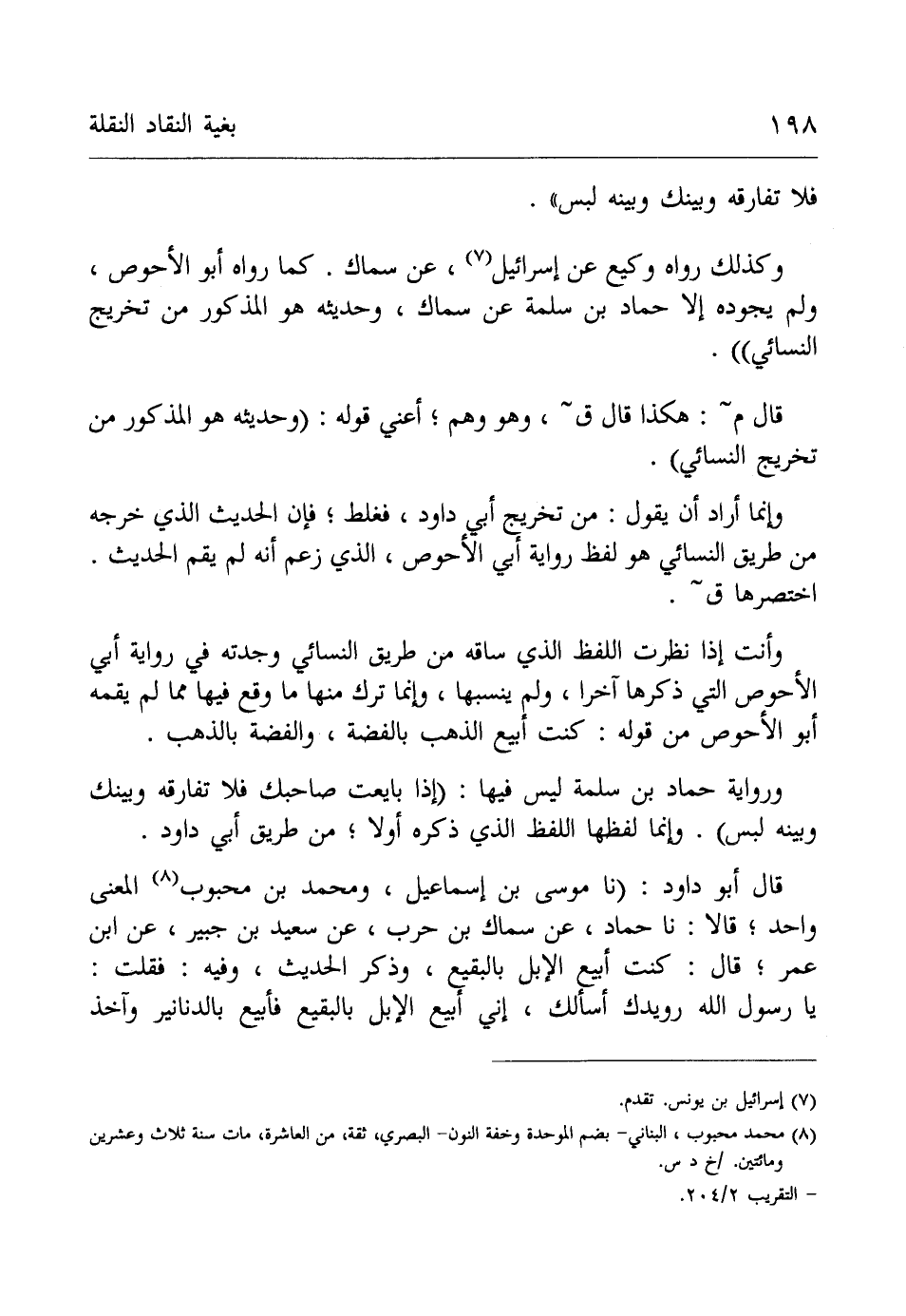 وأنت إذا نظرت اللفظ الذي ساقه من طريق النسائي وجدته في رواية أبي الأحوص التي ذكرها آخرا، ولم ينسبها، وإنما ترك منها ما وقع فيها مما لم يقمه أبو الأحوص من قوله: كنت أبيع الذهب بالفضة، والفضة بالذهب.