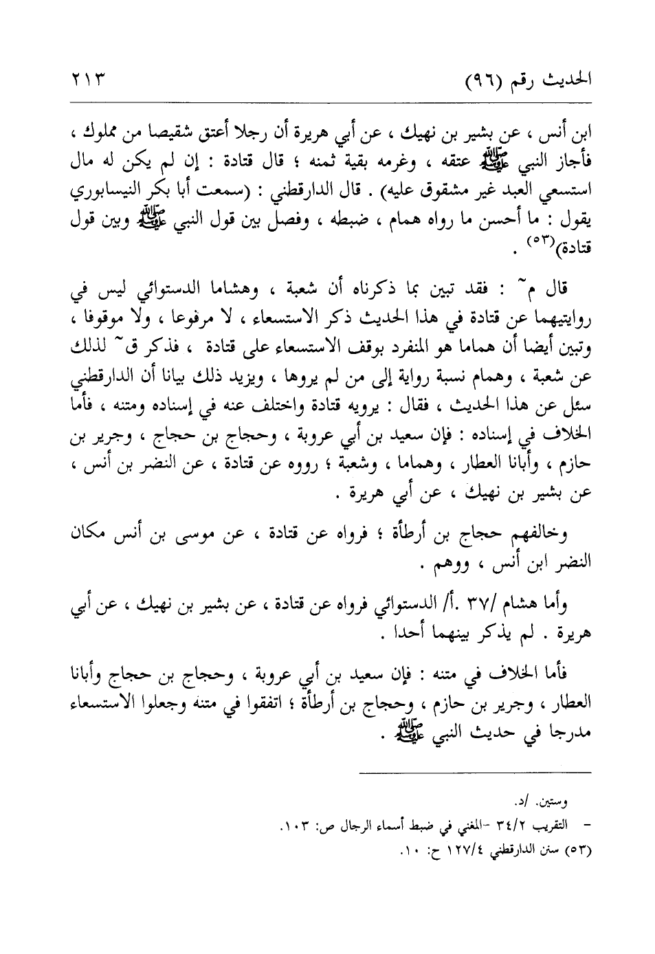 ابن أنس، عن بشير بن نهيك، عن أبي هريرة أن رجلا أعتق شقيصا من مملوك، فأجاز النبي - صلى الله عليه وسلم - عتقه، وغرمه بقية ثمنه؛ قال قتادة: إن لم يكن له مال استسعي العبد غير مشقوق عليه). قال الدارقطني: (سمعت أبا بكر النيسابوري يقول: ما أحسن ما رواه همام، ضبطه، وفصل بين قول النبي - صلى الله عليه وسلم - وبين قول قتادة) (¬53).