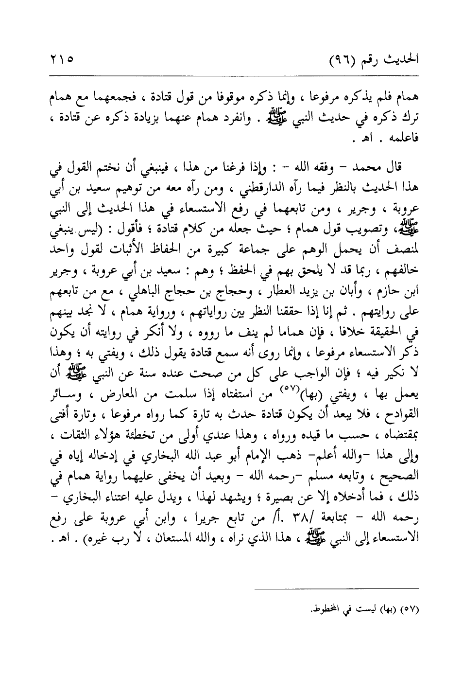 قال محمد -وفقه الله-: وإذا فرغنا من هذا، فينبغي أن نختم القول في هذا الحديث بالنظر فيما رآه الدارقطني، ومن رآه معه من توهيم سعيد بن أبي عروبة، وجرير، ومن تابعهما في رفع الاستسعاء في هذا الحديث إلى النبي - صلى الله عليه وسلم -، وتصويب قول همام؛ حيث جعله من كلام قتادة، فأقول: (ليس ينبغي لمنصف أن يحمل الوهم على جماعة كبيرة من الحفاظ الأثبات لقول واحد خالفهم، ربما قد لا يلحق بهم في الحفظ؛ وهم: سعيد بن أبي عروبة، وجرير ابن حازم، وأبان بن يزيد العطار، وحجاج بن حجاج الباهلي، مع من تابعهم على روايتهم. ثم إنا إذا حققنا النظر بين رواياتهم، ورواية همام، لا نجد بينهم في الحقيقة خلافا، فإن هماما لم ينف ما رووه، ولا أنكر في روايته أن يكون ذكر الاستسعاء مرفوعا، وإنما روى أنه سمع قتادة يقول ذلك، ويفتي به؛ وهذا لا نكير فيه؛ فإن الواجب على كل من صحت عنده سنة عن النبي - صلى الله عليه وسلم - أن يعمل بها، ويفتي (بها) (¬57) من استفتاه إذا سلمت من المعارض، وسائر القوادح، فلا يبعد أن يكون قتادة حدث به تارة كما رواه مرفوعا، وتارة أفتى بمقتضاه، حسب ما قيده ورواه، وهذا عندي أولى من تخطئة هؤلاء الثقات، وإلى هذا -والله أعلم- ذهب الإمام أبو عبد الله البخاري في إدخاله إياه في الصحيح، وتابعه مسلم -رَحِمَهُ اللهُ- وبعيد أن يخفى عليهما رواية همام في ذلك، فما أدخلاه إلا عن بصيرة؛ ويشهد لهذا، ويدل عليه اعتناء البخاري -رَحِمَهُ اللهُ- بمتابعة/38. أ/ من تابع جريرا، وابن أبي عروبة على رفع الاستسعاء إلى النبي - صلى الله عليه وسلم -، هذا الذي نراه، والله المستعان، لا رب غيره). اهـ.