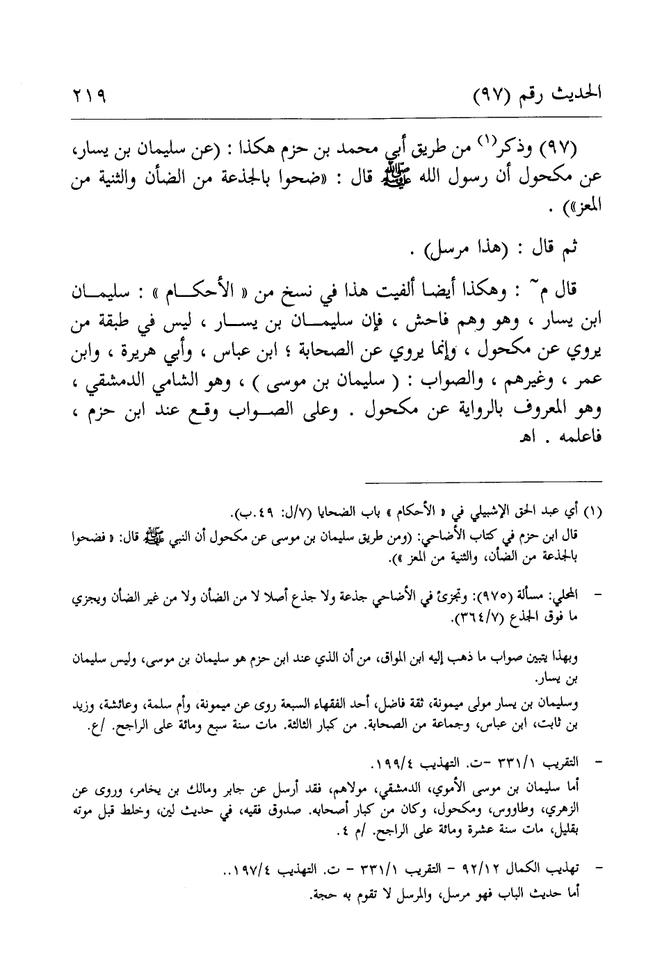(97) وذكر (¬1) من طريق أبي محمد بن حزم هكذا: (عن سليمان بن يسار، عن مكحول أن رسول الله - صلى الله عليه وسلم - قال: "ضحوا بالجذعة من الضأن والثنية من المعز").