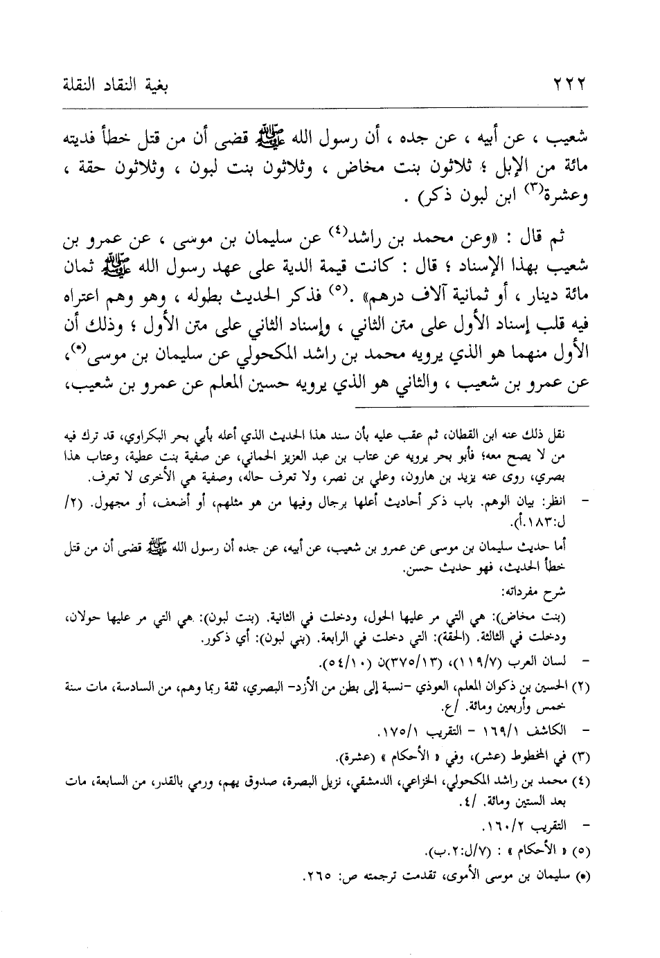 ثم قال: "وعن محمد بن راشد (¬4) عن سليمان بن موسى، عن عمرو بن شعيب بهذا الإسناد، قال: كانت قيمة الدية على عهد رسول الله - صلى الله عليه وسلم - ثمان مائة دينار، أو ثمانية آلاف درهم". (¬5) فذكر الحديث بطوله، وهو وهم اعتراه فيه قلب إسناد الأول على متن الثاني، وإسناد الثاني على متن الأول؛ وذلك أن الأول منهما هو الذي يرويه محمد بن راشد المكحولي عن سليمان بن موسى (*)، عن عمرو بن شعيب، والثاني هو الذي يرويه حسين المعلم عن عمرو بن شعيب،