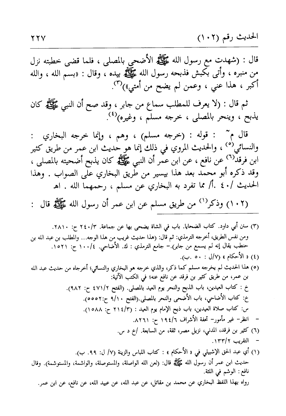 ثم قال: (لا يعرف للمطلب سماع من جابر، وقد صح أن النبي - صلى الله عليه وسلم - كان يذبح، وينحر بالمصلى، خرجه مسلم، وغيره) (¬4).