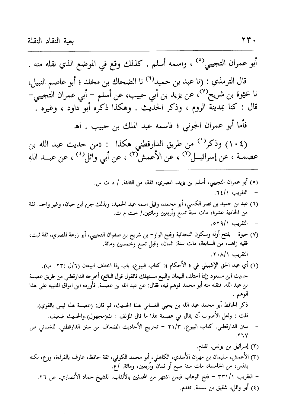 قال الترمذي: (نا عبد بن حميد (¬6) نا الضحاك بن مخلد؛ أبو عاصم النبيل، نا حَيوة بن شريح (¬7)، عن يزيد بن أبي حبيب، عن أسلم -أبي عمران التجيبي- قال: كنا بمدينة الروم، وذكر الحديث. وهكذا ذكره أبو داود، وغيره. فأما أبو عمران الجوني، فاسمه عبد الملك بن حبيب. اهـ